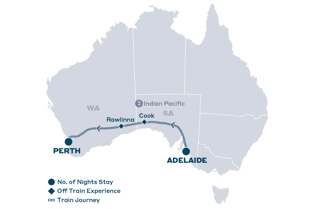 • 3 days / 2 nights aboard the Indian Pacific, travelling from Adelaide to Perth