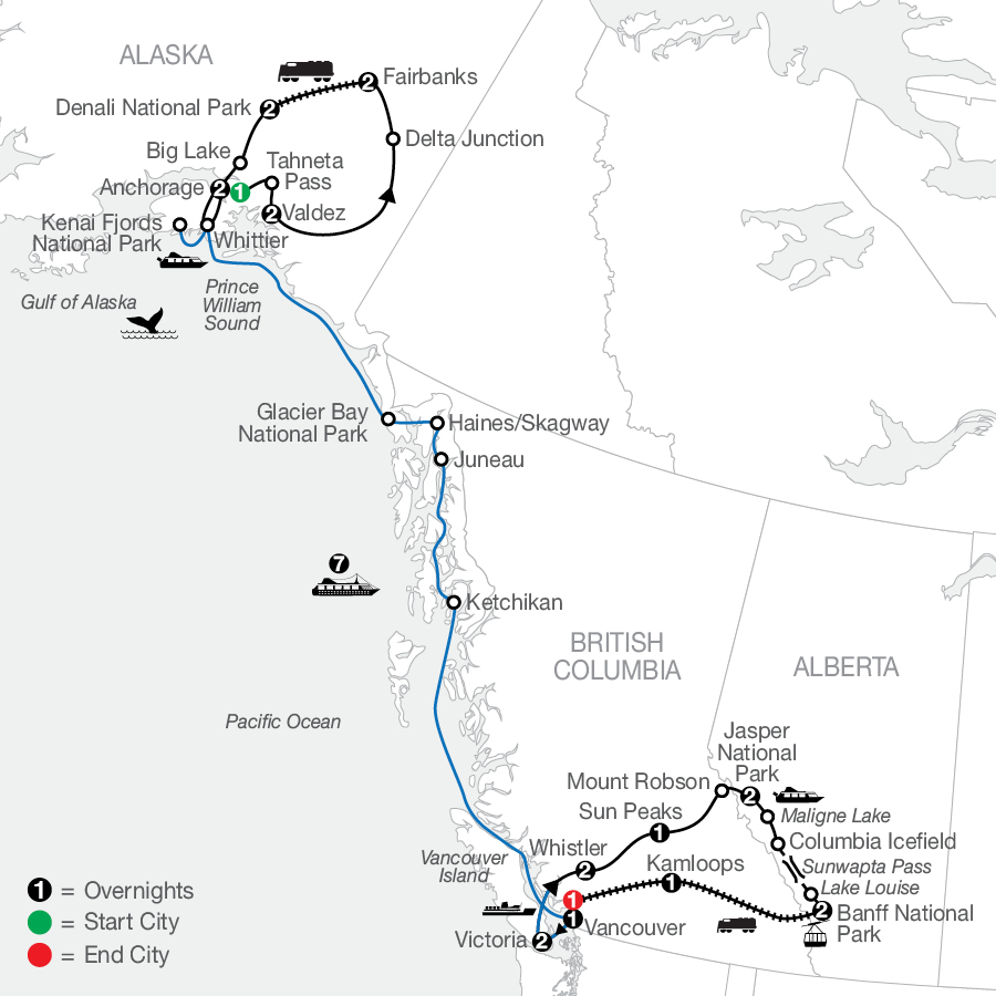 The sky’s the limit in Alaska with 20+ hours of sunlight each day to do more, explore more, and see more mountain peaks and historic places worth their weight in Gold Rush grandeur. Get a rush of your own on a cruise along the three-mile face of the Columbia Glacier, sail by the calving tidewater glaciers of Kenai Fjords National Park and ascend into sky-piercing peaks of Denali National Park aboard the world-famous Alaska Railroad. Pan for gold at Fairbanks’ Gold Dredge #8, see a mushing demonstration by man’s best friends at the home of an Iditarod champion, and watch for wildlife great and small from Alaska’s majestic coasts to its monumental crests where whale, caribou, moose, and grizzlies reign. Cruise through the breathtaking Gulf of Alaska and Inside Passage and glide through the icy waters of Glacier Bay National Park. From jaw-dropping Juneau to the tranquil towns of Haines and Skagway, to the totem-poles and pines of Ketchikan and Kamloops, Alaska beckons adventurers with outward bound discoveries and dazzling natural wonder. From your British Columbia base camp in Vancouver, continue to the Canadian Rockies where gondolas touch the sky atop Banff’s Sulphur Mountain. Dig into Native culture at Whistler’s Squamish Lil’wat Cultural Centre and dine inside the original greenhouse at Victoria’s breathtaking Butchart Gardens. Aim for new heights in Alberta—from Calgary to the Columbia Icefield to iridescent Lake Louise. Go deep in the dramatic canyons and crystal waters of Jasper National Park and return by rail to Vancouver in style on the Rocky Mountaineer train. An Alaska and Canada vacation beyond your wildest imagination! Plus, your tour includes your choice of excursions in Victoria so you can plan your day your way.