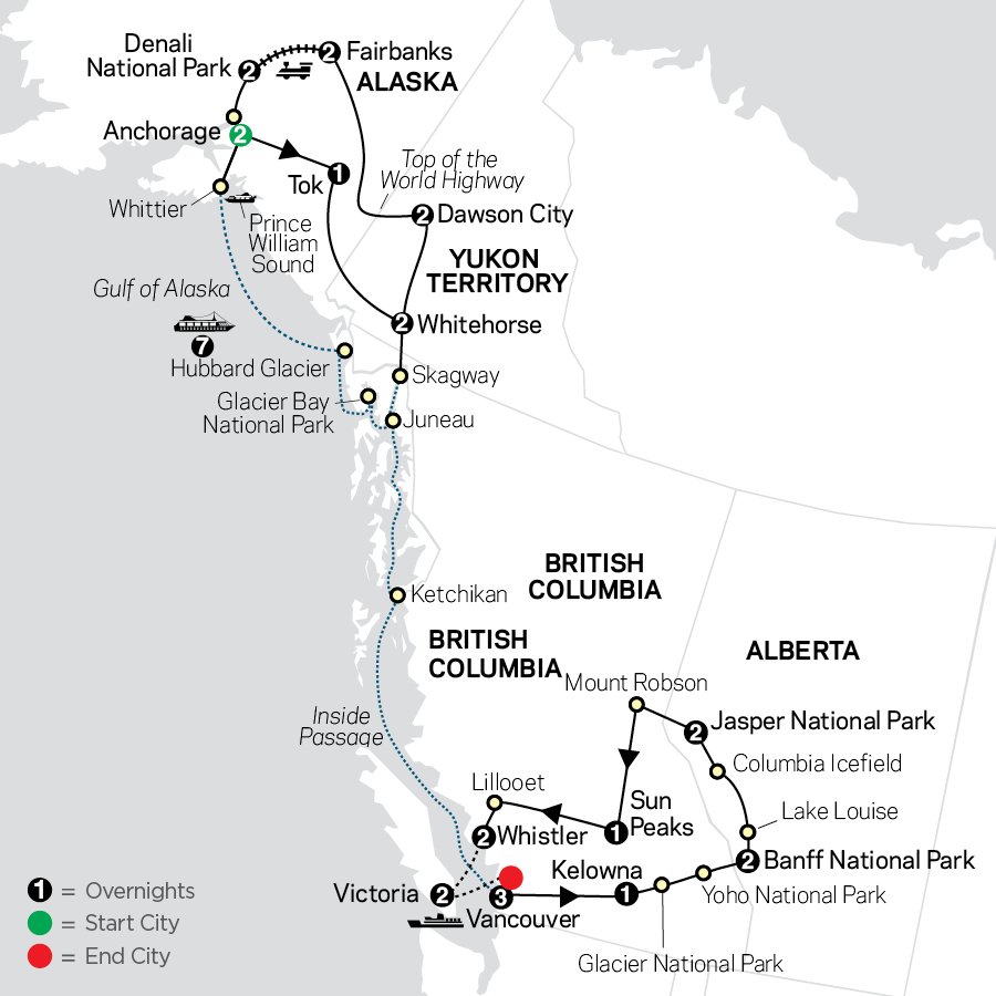 North to Alaska, the Yukon, and the Canadian Rockies! Pack your adventurer’s spirit for an Undiscovered tour with picturesque panoramas, untamed wilderness, and wildlife that freely roam the mountains and open spaces. Cruise on the bountiful waters of Prince William Sound—home to breathtaking glaciers, soaring eagles, abundant marine life, and so much more. Take in dramatic views of Matanuska Glacier and Kluane National Park’s rugged mountains en route to Whitehorse. Conquer the heights of Top of the World Highway en route to Fairbanks and board the Alaska Railroad for Denali National Park and Preserve—home to the highest peak in North America. Have free time there to experience breathtaking aerial views on an optional helicopter ride, go on an optional sled-dog kennel tour or a guided wilderness tour to spot grizzlies, moose, and more. Set sail on your 7-night Alaska cruise featuring the rugged beauty of Glacier Bay National Park, Juneau, Ketchikan, and the magnificent Inside Passage. Disembark and spend time in vibrant Vancouver, B.C. before heading to Kelowna on the shores of Okanagan Lake. View the natural beauty of Glacier and Yoho National Parks before entering Banff National Park with free time to hike, bike, or soak in the natural hot springs. Take in the turquoise waters of Lake Louise as you journey on scenic Icefields Parkway stopping to ride the all-terrain Ice Explorer on the Columbia Icefield. Explore the wilderness of Jasper National Park with free time to go on an optional float trip down the Athabasca River or cruise on Maligne Lake to much-photographed Spirit Island. See soaring Mount Robson and the resort towns of Sun Peaks and Whistler then ferry across the Strait of Georgia to Vancouver Island’s charming city of Victoria. From the remote wilderness of the Yukon to the unmatched beauty of the Inside Passage to the spectacular Canadian Rockies, this remarkable tour will leave you with memories to last a lifetime!