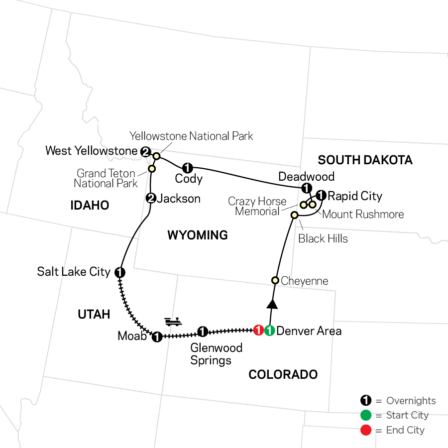 Go west for adventure and treasured discoveries on this exciting vacation through Colorado, South Dakota, Wyoming, and Utah—concluding with three scenic days aboard Rocky Mountaineer’s Canyon Spirit train. From the “Mile-High City” of Denver to the lofty peaks of the Grand Tetons, you’ll experience the Wild West with its stunning vistas and historic lore. Pass through the Black Hills of South Dakota where the legends of the frontier made their mark. Stand at the national monument to four legendary American presidents at Mount Rushmore and see the even larger mountain monument still being carved in honor of Native American legend, Chief Crazy Horse. Follow the trail of pioneers and history-makers like Buffalo Bill en route to Cody, Wyoming, the namesake town William Cody founded in 1896. Be awed by the spectacular natural splendor of Yellowstone National Park, the world’s first national park. Famed for its geothermal landscapes and hydrothermal activity like iconic Old Faithful geyser, Yellowstone is a forested paradise of thundering waterfalls and abundant wildlife. Travel through magnificent Grand Teton National Park with its majestic mountains and glacier-fed lakes. Spend time in the Wild West town of Jackson, with the chance to take an optional float trip down the Snake River. Then board the Rocky Mountaineer Canyon Spirit train in Salt Lake City for an unforgettable three-day scenic journey with overnights in Moab, UT, Glenwood Springs, and Denver. A memorable ending to your adventure in the American West!