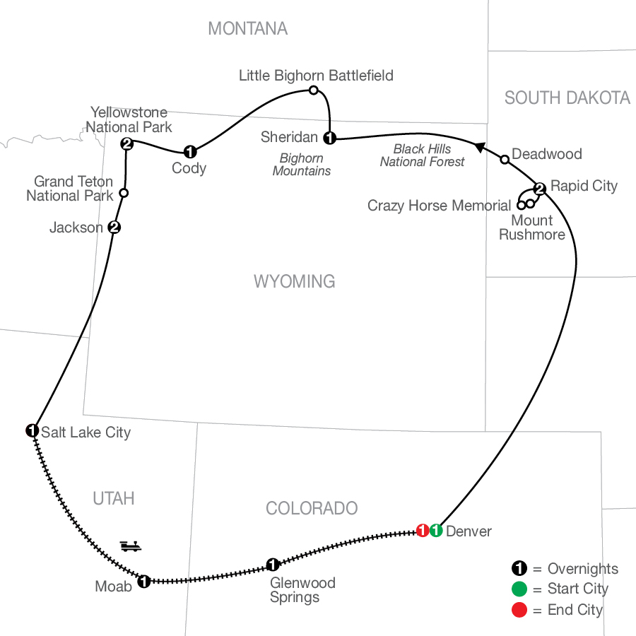 This naturally wonderful National Parks vacation takes you deep into the golden wilderness of untamed South Dakota, Wyoming, and Montana. Strike gold in America’s West with back-to-back visits to some of the country’s best national parks. Come face-to-face with the monumental sculptures of Mount Rushmore, the explosive geysers of Yellowstone National Park, and the towering spires of Grand Teton National Park. Plus, visits to Crazy Horse Memorial, Little Bighorn Battlefield, and the gold rush towns of Cody, Jackson, and Deadwood still echo some of the 19th century’s most famous battles and barroom brawls. . Go deeper into Wild West history aboard the Canyon Spirit to ride the rails through spectacular natural panoramas in perfectly civilized comfort. Continue to the Southwest for a stay in Salt Lake City, Utah! Kick off your national parks vacation and kick up your boots in Colorado’s cosmopolitan capital of Denver. The list of things to do in the “Mile High City” is easily a mile long. Museums and music, breweries, and boutiques, and performing arts and parks await at the foot of the Colorado Rockies. PLUS, your tour includes your choice of excursions in Cody so you can plan your day your way.