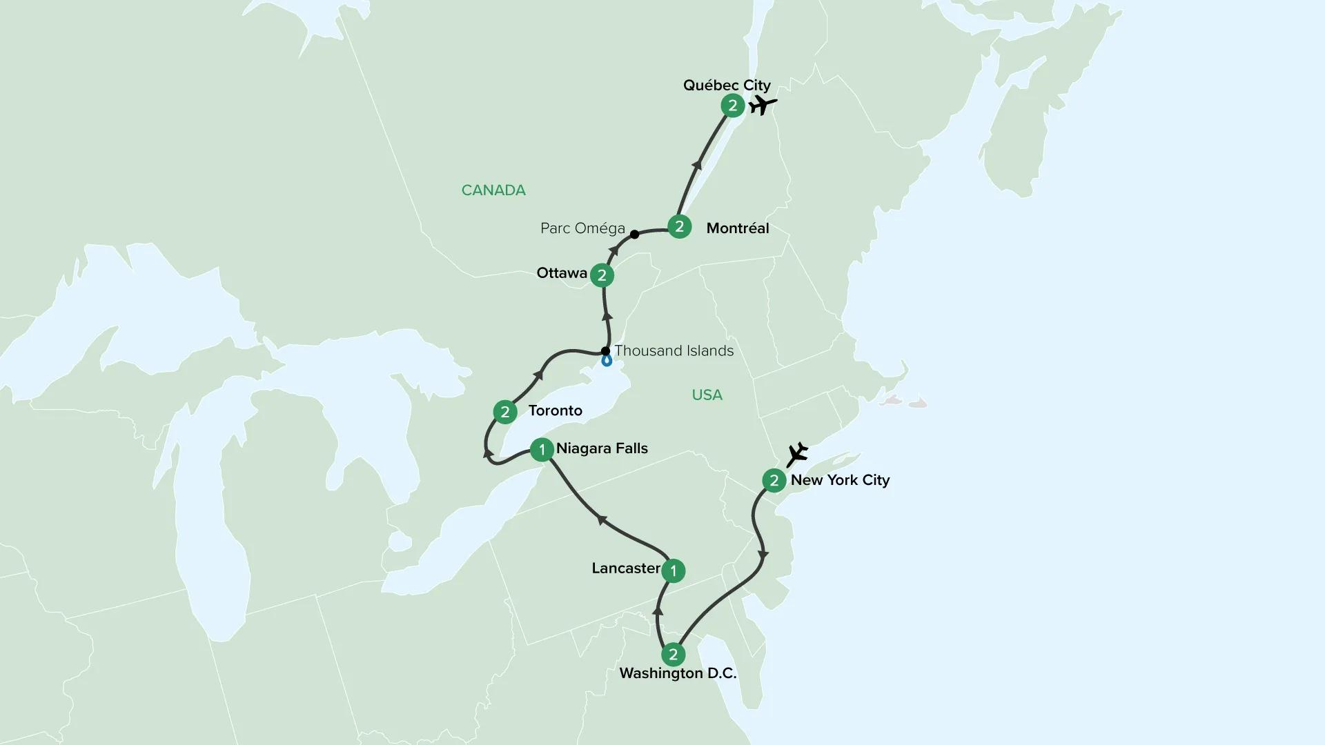 Embark on a 15-day, 14-night land tour across North America, starting in the vibrant heart of New York City with a classic diner experience. Explore Washington DC., and visit its iconic historical and political landmarks. Journey to Lancaster for a traditional Amish feast, then witness the awe-inspiring Niagara Falls. Continue to Toronto, Montreal, and the charming Quebec City, each offering a unique blend of culture, history, and stunning sights.