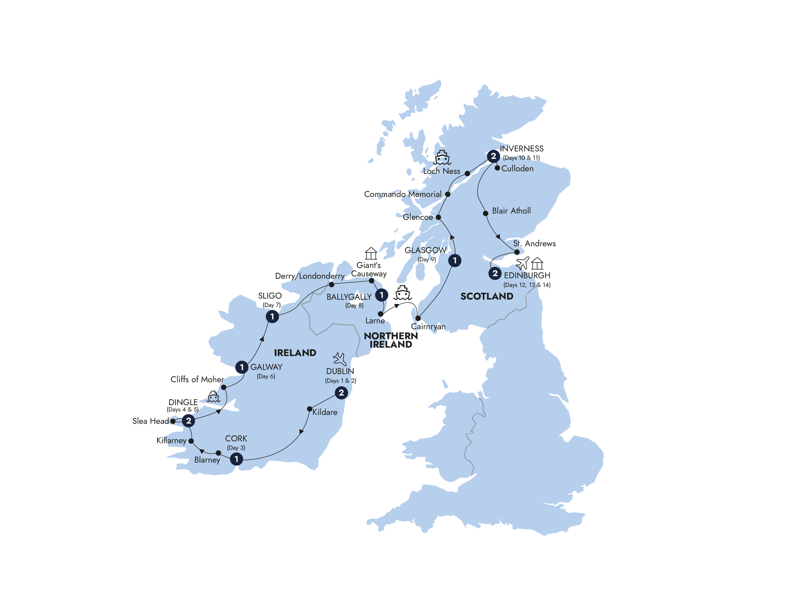 Your 14 days in Ireland and Scotland come to an end after breakfast with transfers arriving at Edinburgh airport.