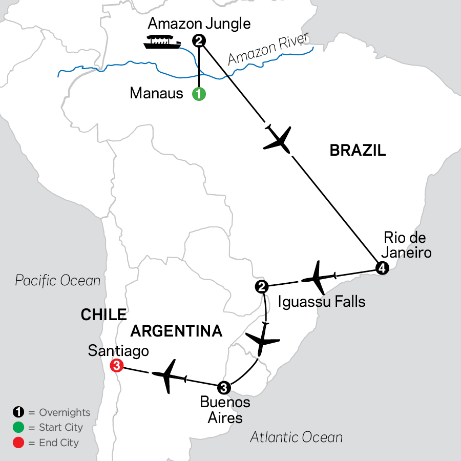 This South America tour features three of the continent's most exciting cities—Rio de Janeiro, Buenos Aires, and Santiago—along with Iguassu Falls and Brazil’s Amazon. At a relaxed pace, you'll enjoy guided sightseeing in each city as well as free time in Rio to sip caipirinhas and visit the famous beaches, in Santiago to people-watch at a lovely café with the snowcapped Andes Mountains as your backdrop, and in Buenos Aires to take an optional excursion to a local estancia (ranch) or a Tango show with dinner. Your guided sightseeing tours include the cog railway in Rio de Janeiro that takes you 2,300 feet up to the summit of Corcovado to view the famous Christ the Redeemer statue and 360-degree views of the city; Recoleta Cemetery, burial site of Eva Perón, in Buenos Aires; and a visit to the 18th-century Cathedral in Santiago.