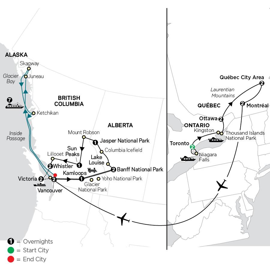 Experience an amazing adventure that combines the exciting cities of Eastern and Western Canada, the natural wonder of Niagara Falls, the breathtaking beauty of the Canadian Rockies, and a spectacular Alaska cruise! See the must-see sights in Toronto, Ottawa, and Québec City. Travel to stunning Niagara Falls for a thrilling sightseeing cruise to view the spectacular falls up close. Cruise through scenic Thousand Islands National Park with views of the opulent mansions of America’s Gilded Age then fly across Canada for a three-night stay in vibrant Vancouver. Board the Rocky Mountaineer Train for a two-day trip through spectacular scenery along the Fraser River to Kamloops, through the Selkirk Mountains to Yoho National Park, and over Kicking Horse Pass across the Continental Divide en route to Alberta and Banff National Park. Soak in spectacular scenery at stunning Lake Louise, ride the all-terrain Ice Explorer on the Columbia Icefield, discover the natural wonders of Jasper National Park, see soaring Mount Robson, and experience the resort towns of Sun Peaks and Whistler. Ferry your way to Vancouver Island to explore the British city of Victoria and world-famous Butchart Gardens before returning to Vancouver to board a 7-night cruise through the Inside Passage to Alaskan ports of call, including Juneau, Skagway, and Ketchikan—plus Glacier Bay, home to more actively calving tidewater glaciers than anywhere in the world. This Canada’s Best from East to West with Rocky Mountaineer and Alaska cruise is the adventure of a lifetime!