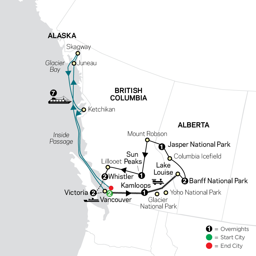 Experience unmatched natural beauty on this affordable Canadian vacation and Alaskan Cruise. Arrive in the exciting city of Vancouver for two nights and enjoy guided sightseeing that includes the harbourfront, Stanley Park, and other famous landmarks. Then board the Rocky Mountaineer Train for a 2-day trip and retrace the route of the great 19th century explorers. Travel through spectacular scenery following the Fraser River through canyons and overnight in Kamloops. Continue on through the Selkirk Mountains and enter Yoho National Park with its towering peaks. Wind through the Spiral Tunnels, an engineering marvel, before your train climbs Kicking Horse Pass then crosses the Continental Divide and enters Alberta and Banff National Park. Spend two nights in Banff with time to hike, stroll through the townsite, or relax at the hot springs. Perhaps treat yourself to an optional helicopter ride for breathtaking views of the Canadian Rockies from above. Visit gorgeous Lake Louise, its turquoise waters perfectly reflecting the surrounding mountains and glaciers. Then travel the stunning Icefields Parkway and take a ride on the Ice Explorer all-terrain vehicle over ice that’s 750-feet-thick! Arrive in magnificent Jasper National Park with the chance to take an optional scenic float trip down the Athabasca River. Journey to the base of 12,972-foot Mount Robson, the highest peak in the Canadian Rockies, on your way to your overnight in the resort town of Sun Peaks. Continue to Whistler where you’ll spend two nights and have time to enjoy the many activities this legendary resort village has to offer. Cross via ferry to Victoria for sightseeing and a visit to world famous Butchart Gardens with its 55 acres of floral displays. Enjoy a day at leisure to explore Victoria before returning to Vancouver where your adventure continues with a 7-night cruise through the Inside Passage to Alaskan ports of call. Follow the coast through spectacular waterways to watch for orcas, whales, otters, and eagles. Dock in Juneau on the Gastineau Channel and visit the Alaskan capital’s rustic shops in town. Next port is Skagway, with its history of tough prospectors who passed through on their way to find Gold in the Yukon. Cruise on to Glacier Bay, which has more actively calving tidewater glaciers than anywhere in the world. Your last port of call is the picturesque town of Ketchikan, known as the “Salmon Capital of the World.” More scenic cruising takes you back to Vancouver where your journey may end but the memories you’ve made on this Canada and Alaska adventure will last a lifetime!