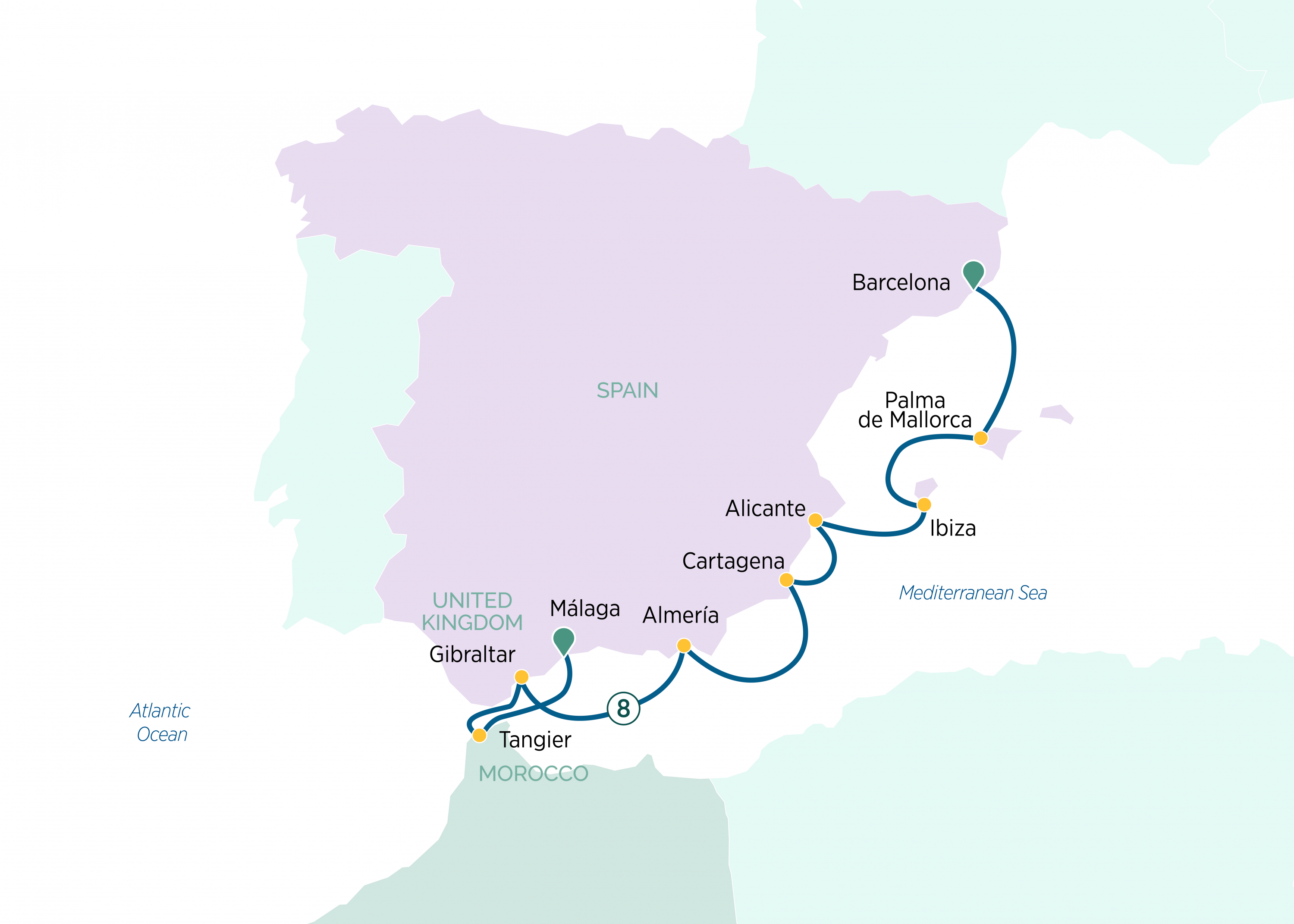 Enjoy a morning sail across the Strait of Gibraltar to Tangier. Europe's gateway to Africa for centuries, Tangier welcomes you with a blend of exotic cultures and influences unique to Morocco. The diversity of the bustling local crowds, the fragrances of spices in the colourful markets and the murmurs of the sea and – it’s a feast of sensations that stuns the senses.