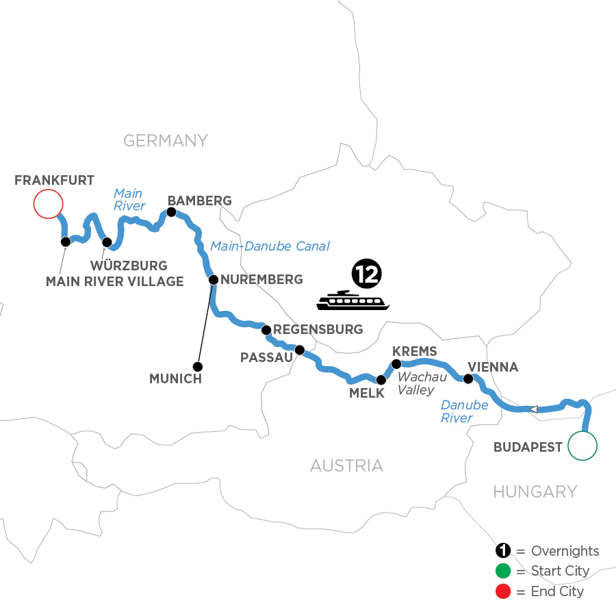 Board your Avalon Suite Ship® in Budapest, called the “Pearl of the Danube.” Sail on your European river cruise to visit Vienna, picturesque Krems, and through beautiful views of the rich wine-growing region of Austria’s Wachau Valley. Your Danube River cruise continues to Melk, where you’ll see its magnificent Benedictine Abbey, with fantastic frescoes, statues, library, and ornate pipe organ. Your Germany river cruise continues with an excursion to Nuremberg. While sailing, you’ll hear an onboard lecture about Christmas traditions in Europe and choose from two guided excursions—a classic sightseeing tour of Nuremberg, or a tour of the historic Nuremberg Rally Grounds of WWII notoriety. Continue your festive European vacation to enjoy Christmas in the Heart of Germany with a guided sightseeing tour of the glowing Christkindlesmarkt of Bam-berg—complete with dozens of nativity scenes of every size. Würzburg is the next stop on your Christmas cruise through Germany. Savor the sights, sounds, and confections of Würzburg’s warm Christmas markets before sailing to visit a picturesque Main River Village. Your Danube and Main River cruise vacationconcludes in Mainz Frankfurt with wonderful experiences and memories of Christmas markets, scenic splendors, and inspiring discoveries to treasure always.