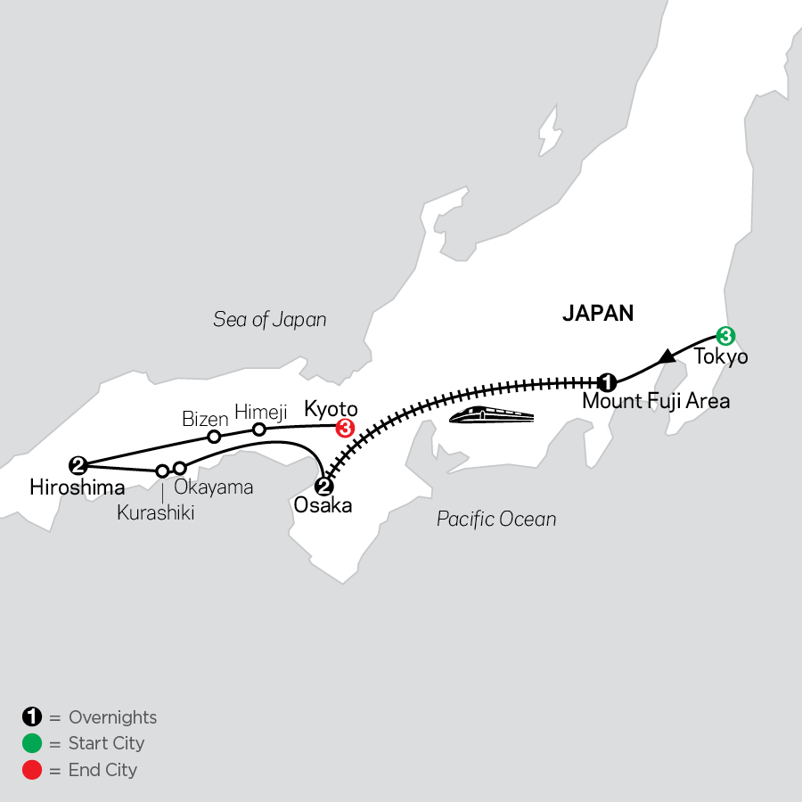 The world is within reach with everything you need for perfectly affordable touring. Cosmos includes hand-selected accommodations, guided sightseeing, and seamless transportation between destinations—with value-minded travel lovers in mind. Explore with expert Cosmos Tour Directors and Local Guides, private, first-class, air-conditioned motorcoach with free Wi-Fi (where available). Enhance your free time to explore like a local with your CosmosGO mobile app!Your tour includes:•Guided city sightseeing of Tokyo including admission to Meiji Shrine, Shinjuku Gyoen Garden, Asakusa Kannon Temple, and Nakamise Shopping Arcade•Admission to Mt. Fuji ropeway and Chureito Pagoda•Bullet train ride from Mt. Fuji area to Osaka•Guided city sightseeing of Osaka including admission to the Open-Air Museum of Old Japanese Farmhouses, Osaka Castle, and Koraku-en Garden•Guided city sightseeing of Hiroshima including admission to Peace Memorial Park, Miyajima Island and visit to Itsukushima Shrine•Pottery workshop•Admission to Himeji Castle•Guided city sightseeing of Kyoto including admission to the Temple of the Golden Pavilion, Sanjusangendo, and Fushimi Inari shrine•Guided walking tours of Nishiki Market and the Gion district•Traditional tea ceremony
