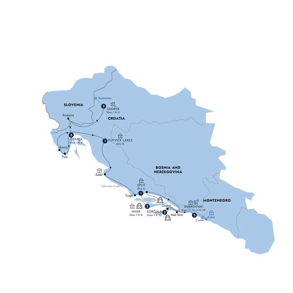 The green forests of Plitviče Lakes National Park give way to pebble-dashed shores lapped by turquoise waters. Walk through the Roman Ruins and market to see the sea organ of Zadar. Witness the dramatic change in landscape, as you travel through Mediterranean olive groves on your way to Trogir, a city founded by the Greeks in 3rd century BC. Admire the cathedral and Renaissance Čipiko Palace before continuing to the historic city of Solin. In the evening, don't miss the opportunity of dinner in a traditional konoba.