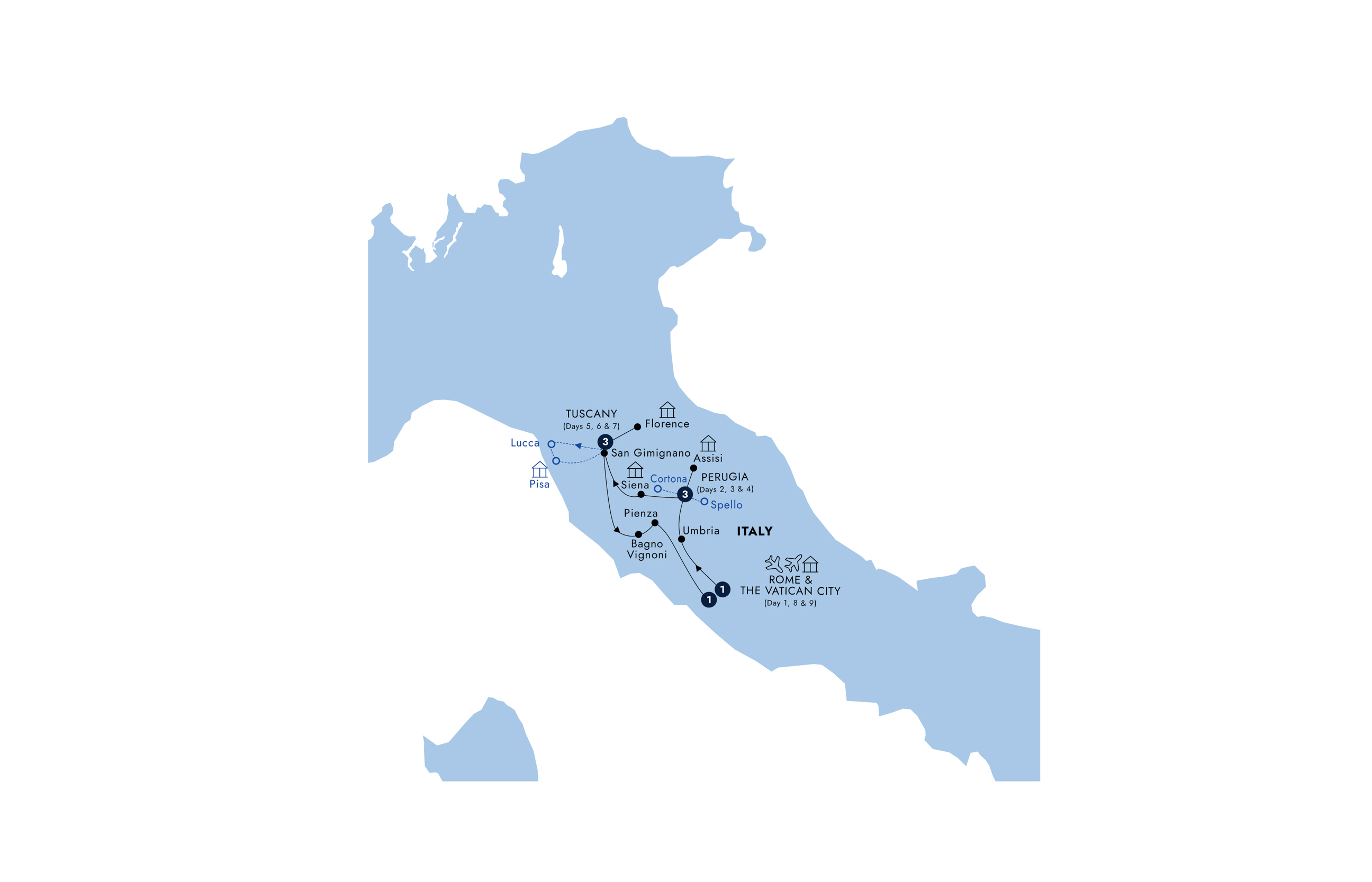 Enjoy the rolling Tuscan hills as you journey south through the Italian countryside. This morning, visit the medieval spa town of Bagno Vignoni, renowned for its mineral-rich thermal baths, then continue to the ‘model’ Renaissance town of Pienza, famous for its delicious pecorino cheese, before making your way to Rome.