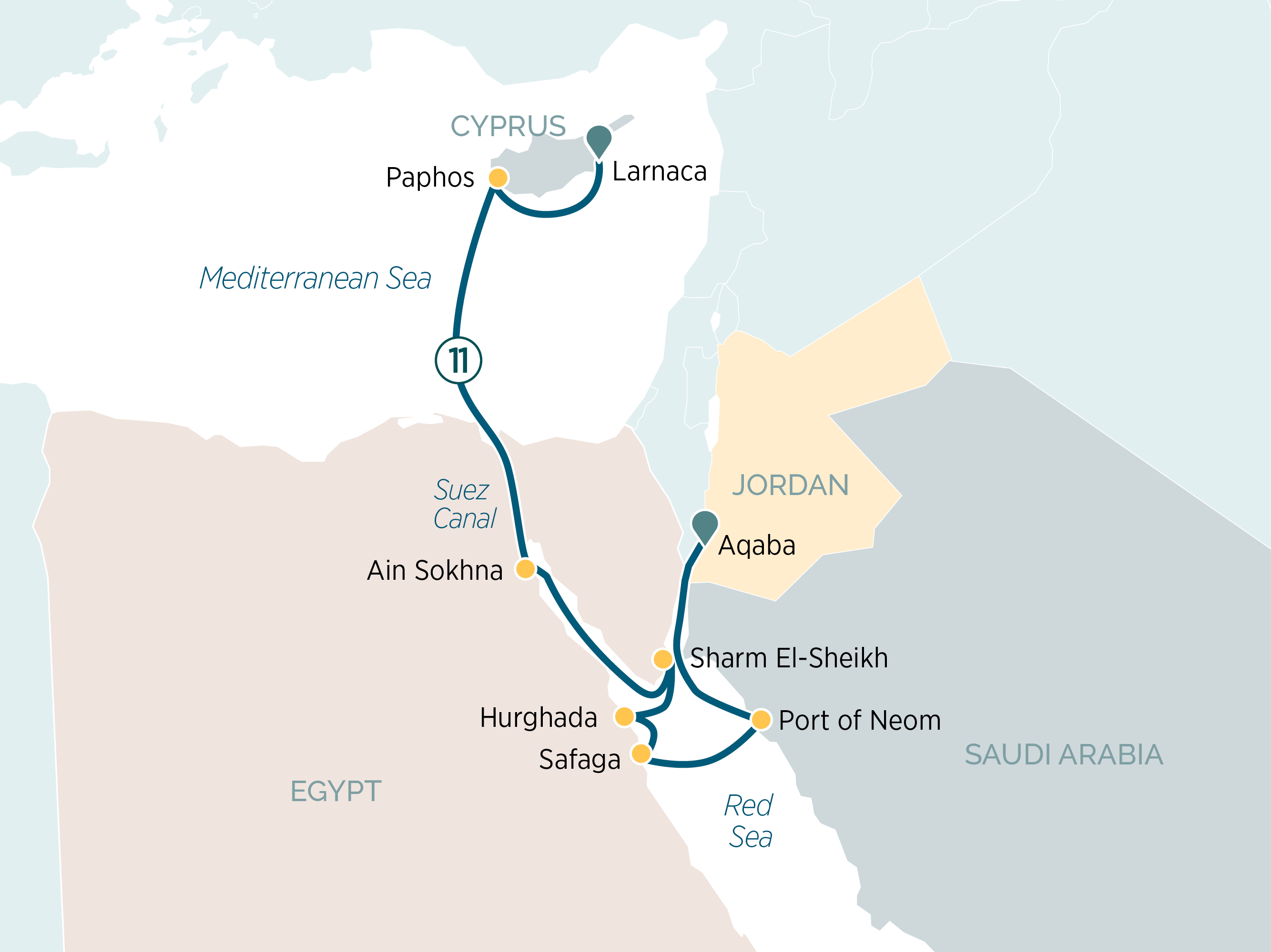 Today we cross the Suez Canal before reaching Egypt’s Ain Sokhna. The Suez Canal, built by Ferdinand de Lesseps and completed in 1869, carves through 162km of desert, linking the Mediterranean to the Red Sea.