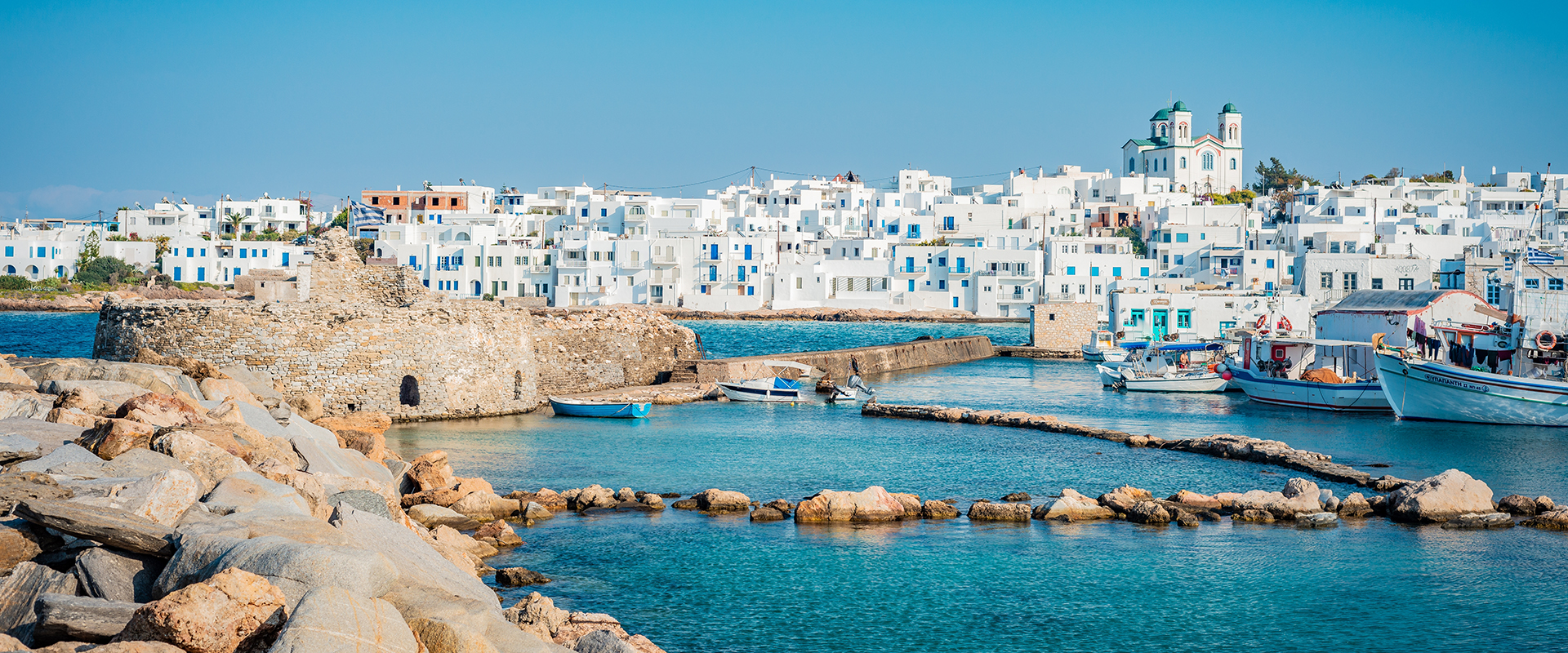 The paradise island of Paros rose to power and prosperity in the sixth century BC for its high-quality marble, Parian marble, used for the construction of many temples and public buildings. It’s home to ancient ruins, Venetian castles and traditional Greek architecture,and draws in visitors to its stunning beaches, crystal-clear azure waters and charming local villages. The main town, Parikia, is nestled on a hill overlooking the port. Its cobbled lanes are bustling with activity, lined with shops, cafés and restaurants serving delicious local Greek cuisine. It also has a historic Frankish castle built in the 1200s. The island’s other town, Naoussa, is a picturesque harbour wherewooden boats sway and waterside restaurants grill freshly caught seafood.