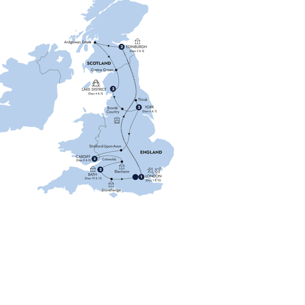 Depart the majestic Scottish capital and journey to Ardgowan, set on a stunning 10,000-acre coastal estate. Sir Ludovic Shaw Stewart welcomes you to his family castle. Learn the history of the Shaw Stewart family and the conservation efforts to protect the land on this MAKE TRAVEL MATTER® Experience. Continue to Gretna Green to see the famous spot where runaway lovers were married at the blacksmith's shop. Your travels continue to the picturesque English Lake District.