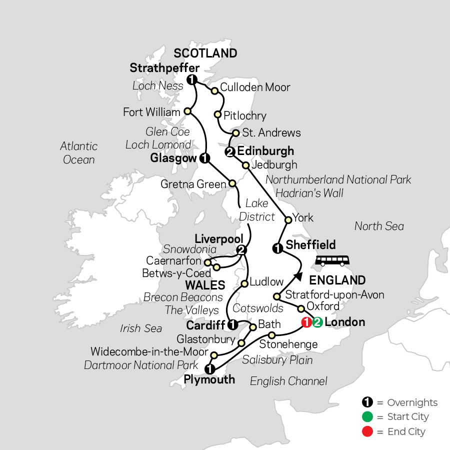 Experience some of Britain’s fascinating towns as you travel through England, Scotland, and Wales, stopping for overnights in London, Leeds, Edinburgh, Strathpeffer, Glasgow, Liverpool, Cardiff, and Plymouth.Part of the charm of exploring through Britain is seeing the spectacular scenery, and on this Britain tour, you’ll get the opportunity to witness some of its most scenic areas. Travel through Northumberland National Park, with its wide-open spaces and views of endless beauty; Brecon Beacons National Park, with its dramatic landscapes; Dartmoor National Park; and incomparable Snowdonia National Park in Wales, with picturesque villages, mountains, and lakes. Drive through the serene Lake District, England’s largest and finest natural park and a UNESCO World Heritage Site. On your way to Glasgow, admire some of Scotland’s most stunning scenery, including vast areas of unspoiled wilderness and gorgeous lochs (lakes).On this Britain tour, you’ll also travel to some of Britain’s charming towns. In Stratford-upon-Avon, explore the town that Shakespeare called home and get a glimpse into life in 16th-century England. Walk through York’s quaint streets with your Tour Director and marvel at England's most complete medieval city. In Bath, explore the elegant city famed for its excavations of the 2,000-year-old Roman baths. In Plymouth, see the Mayflower Steps, where the Pilgrim Fathers embarked in 1620. Enjoy an orientation drive in Cardiff, the capital of Wales, and sightseeing in Edinburgh, Scotland’s capital.These are just some of the many highlights of this value-minded Britain tour through England, Scotland, and Wales.