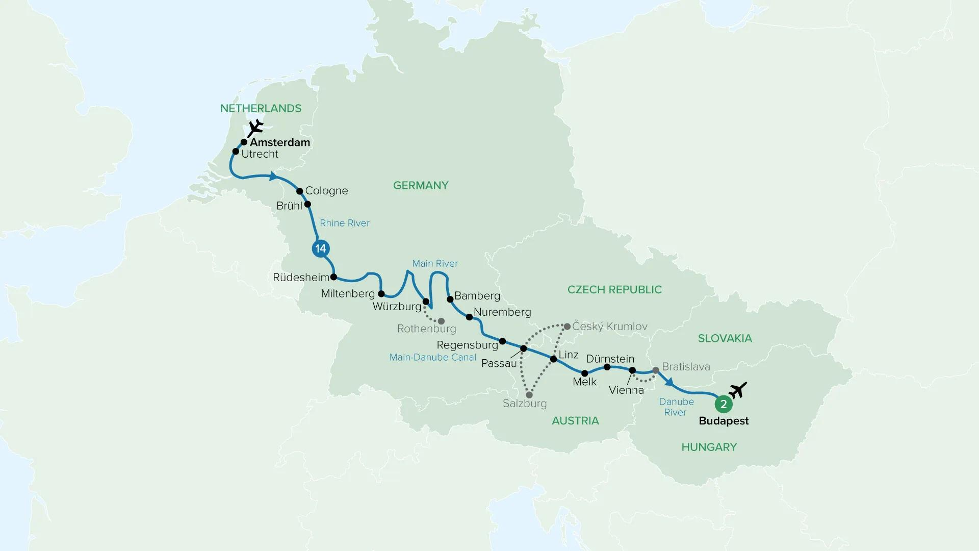 Sail the great waterways of Europe on a 14-night journey from Amsterdam to Budapest, followed by extra time to linger in Hungary’s grand capital. Cruise the Rhine, Main and Danube rivers past storybook towns, vineyard-lined valleys and imperial cities, visiting Cologne, Bamberg, Vienna and more. Discover castles, abbeys and medieval squares by day, then enjoy relaxed evenings on board. In Budapest, delve deeper into the city’s history and culture with guided touring and time to explore at your own pace — the perfect finale to this classic European river voyage.