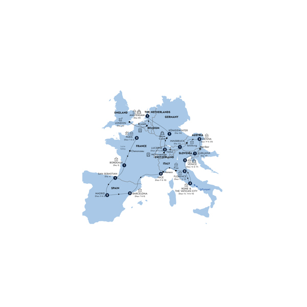 See Paris icons like the Champs-Élysées, enjoy the gastronomic delights of pintxos tasting tours in San Sebastian, the foodie city of Spain and try your hand at Venice glassblowing in Italy, all on this grand European tour. From boutique fashionista shopping in the avenues of Paris to Picasso's trail blazing masterpieces in Madrid, this cultural tour de force is all encompassing. Barcelona dazzles with Gaudi's masterpiece—La Sagrada Família. The French Riviera offers an abundance of opulence, the Promenade des Anglais in Nice, the harbour of Monaco packed to the brim with luxury yachts, and in Vienna the regal history of Austria's Habsburg dynasty fires up the imagination.