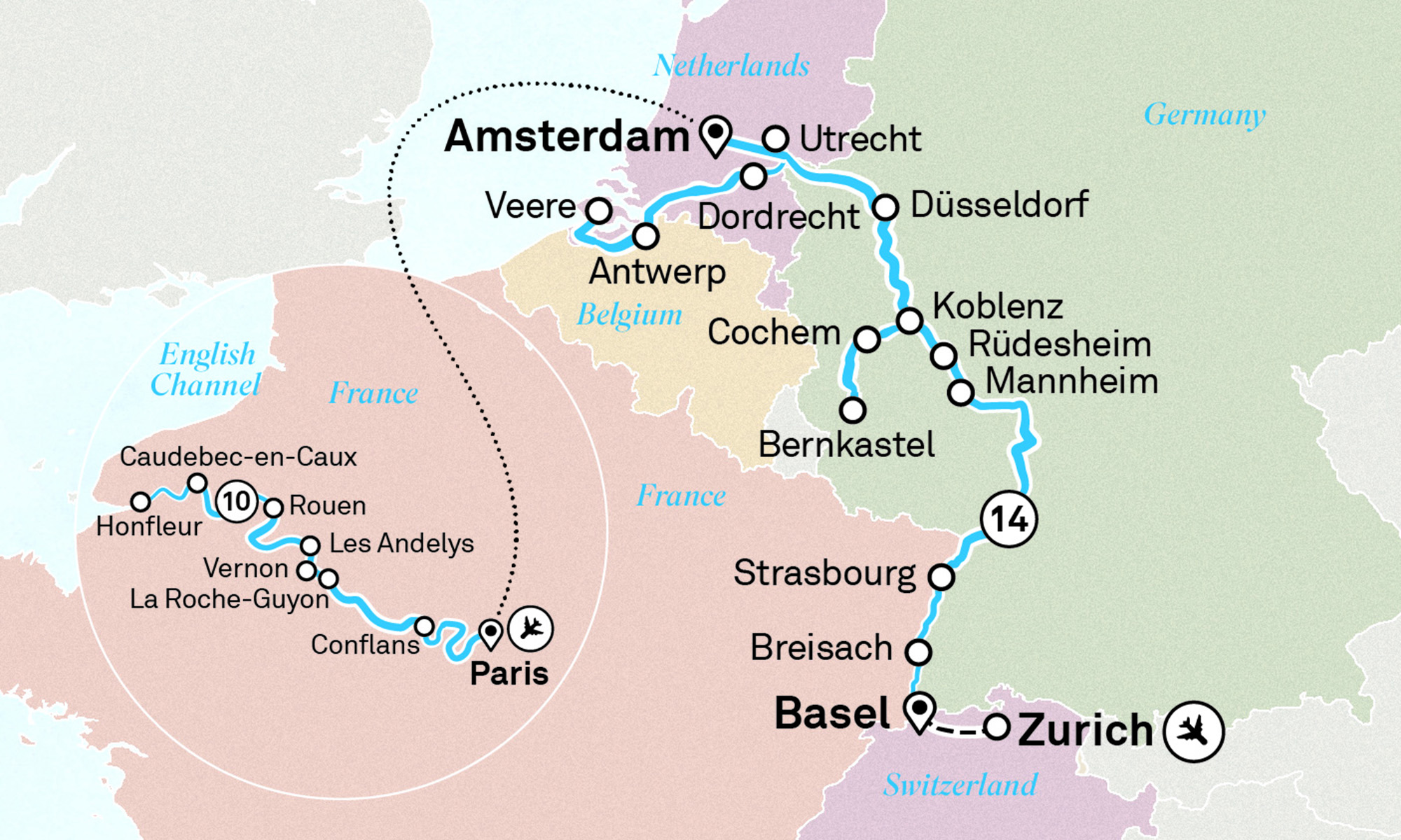 Your cruise concludes this morning in Basel. Enjoy one final breakfast on board, then disembark and transfer to Zurich Airport, taking with you lifelong memories of a remarkable journey across a continent.