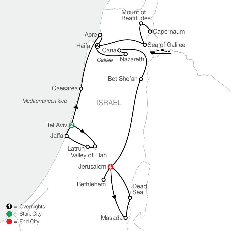 • Visits in Jerusalem include Yad Vashem and the Israel Museum, the Church of the Holy Sepulchre, the Western Wall, the Upper Room of the Last Supper, and King David’s tomb. Plus, views of the Garden Tomb, Mount of Olives, and Garden of Gethsemane