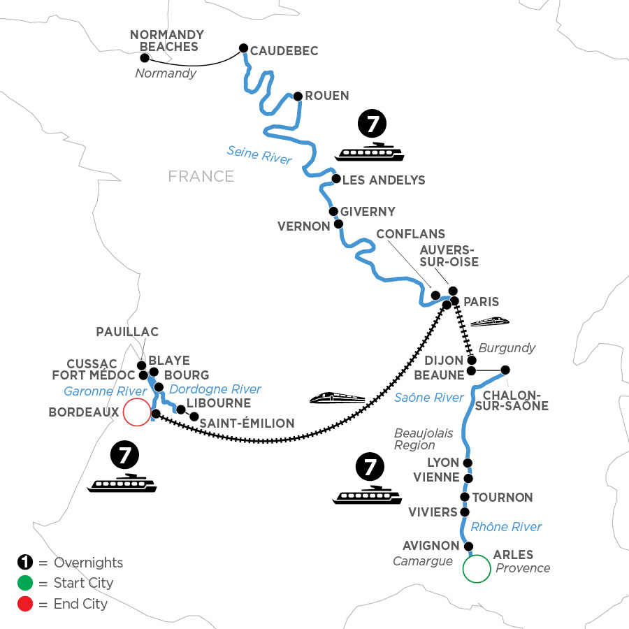 The timeless charms of France flow freely on this French river cruise vacation brimming with breathtaking views and vibrant history. Embark on the resplendent Rhône River with a visit to Arles, France—home to the brilliantly preserved 1st-century Roman Amphitheater and the colorful settings that inspired some of Van Gogh’s most moving paintings. More stirring sights await you on the Rhône, including the world’s largest Gothic palace—Avignon’s 14th-century Palace of the Popes. Visit Tournon—beautifully nestled among the vineyards. Delight in the delicacies and delicious French fare of Lyon, France’s gastronomic capital—a showcase of magnificent medieval and Renaissance architecture. Your French river cruise adventure continues on the Seine River with an exciting selection of excursions, including a visit to the historic Normandy Landing Beaches, including Omaha Beach, the Point du Hoc monument, and the American Cemetery; a visit to delightful Les Andelys, Joan of Arc’s Rouen, and the choice between a visit to Vincent van Gogh’s Auvers-sur-Oise or Napoleon and Josephine’s Malmaison. Be wined and dined along the way with stops in France’s most charming and historic locales, highlighted by a visit to Paris—the City of Light. Take in the legendary sites of this enchanting city.