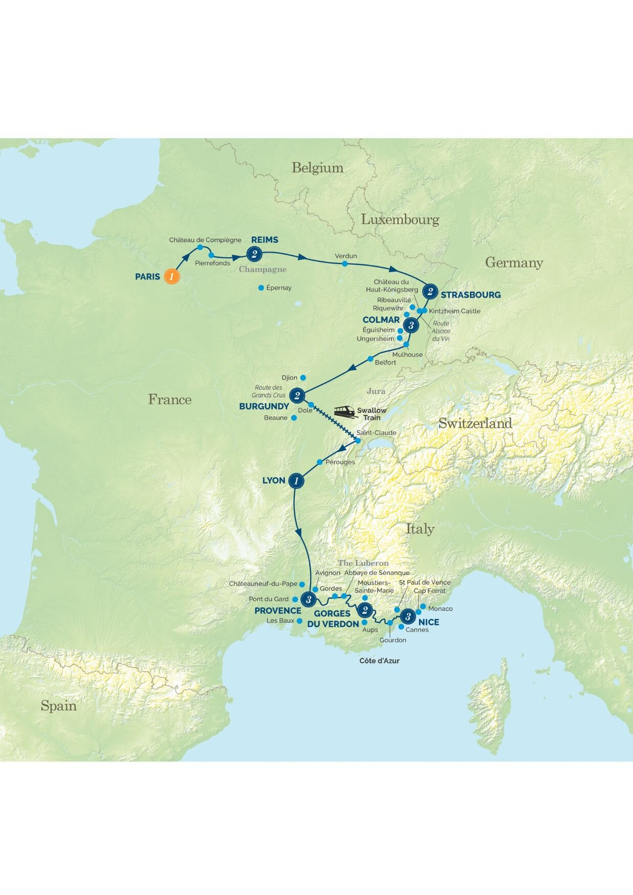 You will explore grand royal châteaux, wander medieval villages lined with half-timbered houses and seemingly untouched by time, savour world‑class wines in ancient vineyards, and stand in places where history changed the course of nations. From Champagne country to the poignant battlefields of Verdun, from the colourful canals of Colmar to the dramatic cliffs of the Verdon Gorge, and finally to the shimmering Mediterranean shores of Nice -each day offers a new experience, paints a new story, and adds a new memory to treasure. With carefully selected hotels in exceptional locations, gourmet dining, breathtaking scenery, and a balance of included guided experiences and personal ‘My Time’, this journey invites you to simply relax, immerse yourself, and enjoy the splendour of France. All done the Albatross Way!