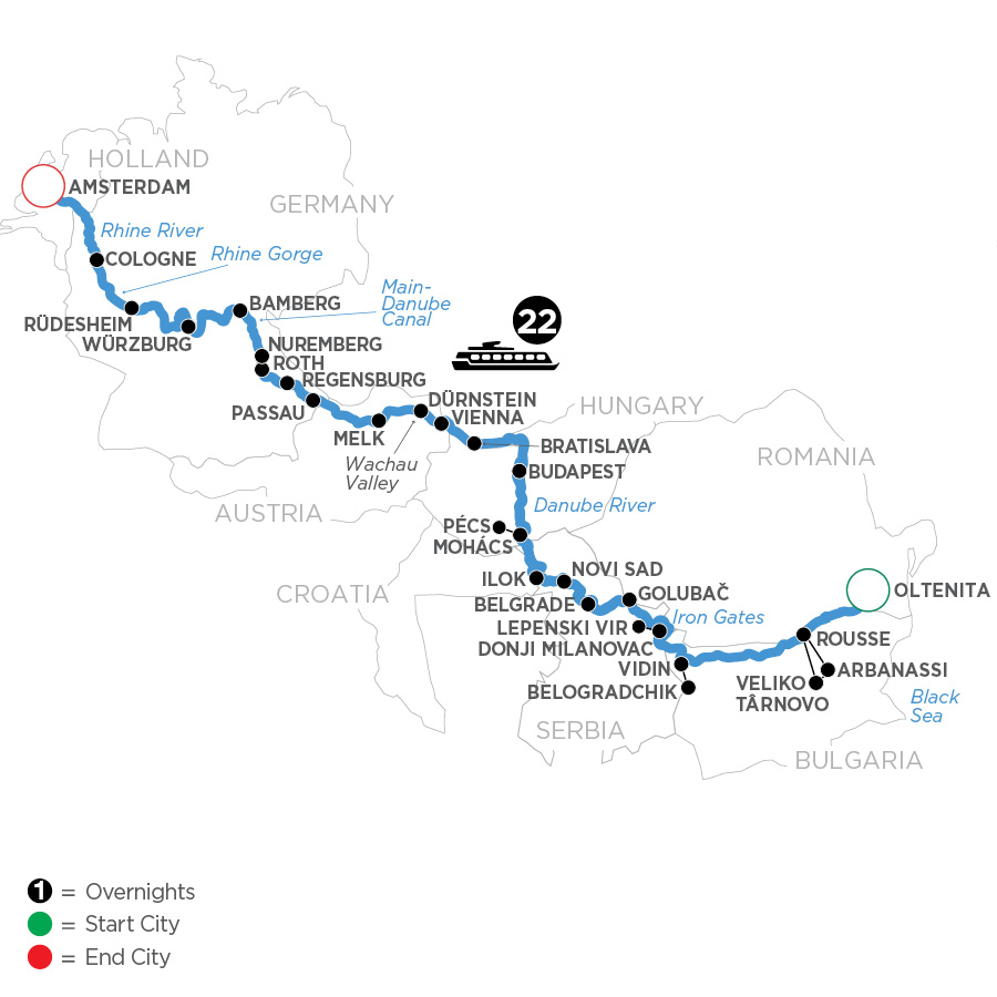 This enchanting European river cruise from Romania to Amsterdam is truly an adventure. Glide past quaint towns, beautiful views, and historic buildings along the Danube, Main, and Rhine Rivers—and onshore enjoy guided sightseeing and free time to explore. Explore with guided sightseeing in Bulgaria’s ancient capital of Veliko Târnovo. Visit the Ethnographical Museum and Church of the Nativity in Arbanassi and take pictures of Belogradchik’s eclectic group of rock formations and the spectacular views of the Iron Gates. Your Danube River cruise takes you to the capitals of three countries: Belgrade, Serbia; Budapest, Hungary; and Vienna, Austria, where Local Guides will show you the highlights with time to explore on your own. In the heart of the Wachau wine region, take a guided walk in charming Dürnstein, and later visit Melk’s famous Benedictine Abbey. In Germany, enjoy guided sightseeing in Passau, Regensburg, Nuremberg, Bamberg, and Würzburg. Cruise the Main Danube Canal and pass through the dramatic Rhine Gorge—the most beautiful view of the Rhine River where ancient castles stand on cliffs 400 feet above the water. This extraordinary European river cruise concludes in Holland’s popular, modern capital of Amsterdam. Get a unique perspective of the city on a canal cruise along the elegant Grachten lined with homes dating back to the city’s “Golden Age.” Experience the Danube River like never before, with the special experiences and discoveries revealed from Romania to the North Sea.