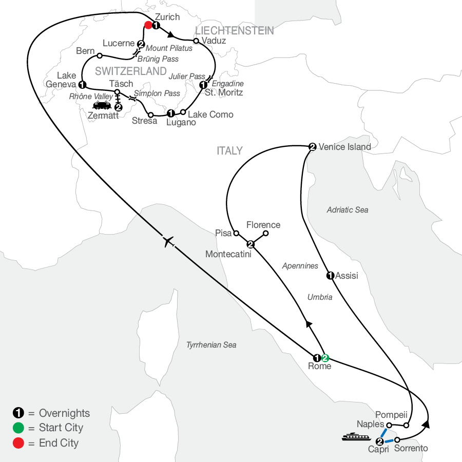 Layered like a slice of decadent tiramisu, this irresistable tour of Italy and Switzerland is filled with its sweetest cities for a rich and rewarding experience. How do you top the history, wonder, and charisma of Rome? With the world-class art of Florence, the alluring romance of Venice, the quiet serenity of Assisi, the historical fascination of Pompeii, and the pure indulgence of Capri. The satiating fun continues as you enter the vine-clad Tuscan hills famous for their signature Chianti wine—and speed across the glittering Bay of Naples to the citrus-scented town of Sorrento renowned for its locally produced Limoncello liqueur. You’ll have the opportunity to snap creative photos at the Leaning Tower of Pisa and devour more magnificent architecture—and artful cuisine—throughout this multi-tiered tour of Italy and Switzerland.