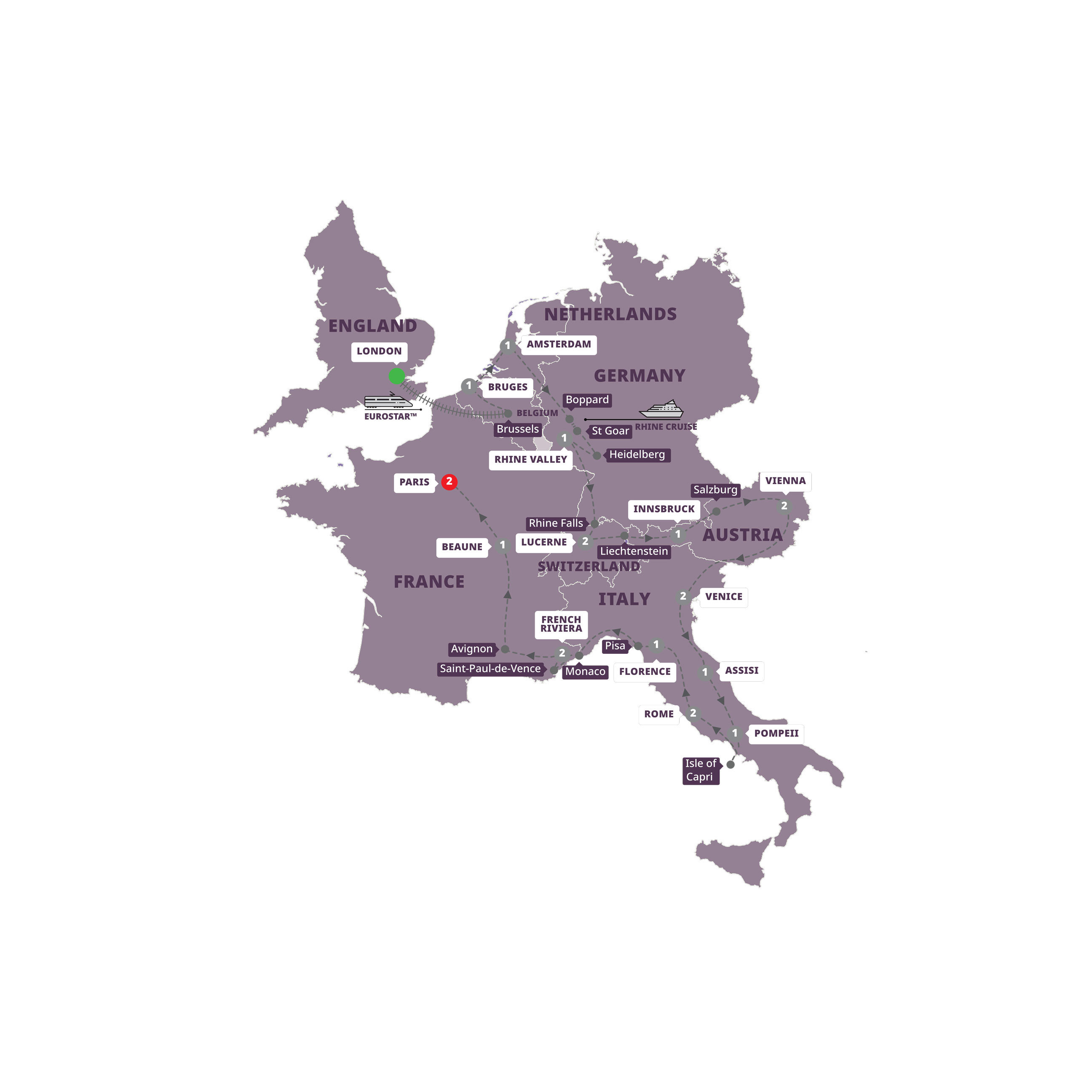 • Discover Amsterdam, Heidelberg, Lucerne, Innsbruck, Venice, Pisa, Monaco and Avignon