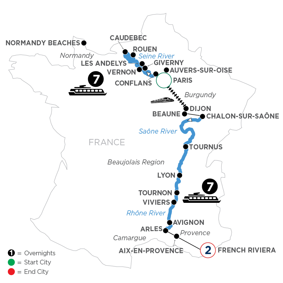 Set sail on your Seine River cruise and sail to Vernon with your choice of a visit to Claude Monet’s Giverny or Bizy Castle, nicknamed “Normandy’s Versailles. In Caudebec, take an excursion to the historic Normandy Landing Beaches, including Omaha Beach, the Pointe du Hoc monument, and the American Cemetery, or select an excursion for a traditional “Taste of Normandy.” Visit Joan of Arc’s Rouen, then choose between a visit to Vincent Van Gogh’s Auver-sur-Oise or Napoleon and Josephine’s Malmaison. Return to Paris for your choice of sightseeing in the “City of Light”—discover the true heart of Paris on a guided walk through the sites of Paris’ rich history, or take a guided city tour to see its famous landmarks. Board a high-speed train bound for Dijon, and transfer to Beaune to embark on your second Avalon Suite Ship® in Chalon-sur-Saône.