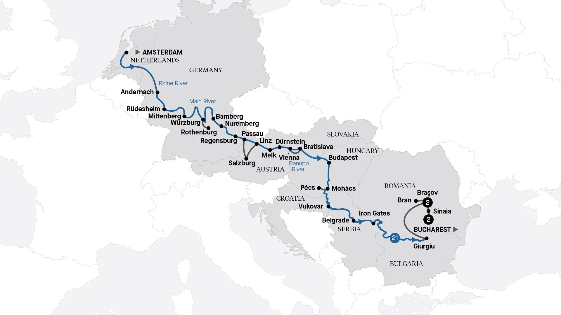 Discover the charms of Europe from west to east on a scenic river cruise beginning in Amsterdam. Journey through historic towns and iconic cities including Nuremberg, Vienna, and Budapest, enjoying a mix of cultural experiences and stunning landscapes. Cruise the dramatic Iron Gates gorge before concluding your adventure with immersive visits to Bran Castle, Bra?ov, and the lively streets of Bucharest in Romania’s captivating Carpathian region.