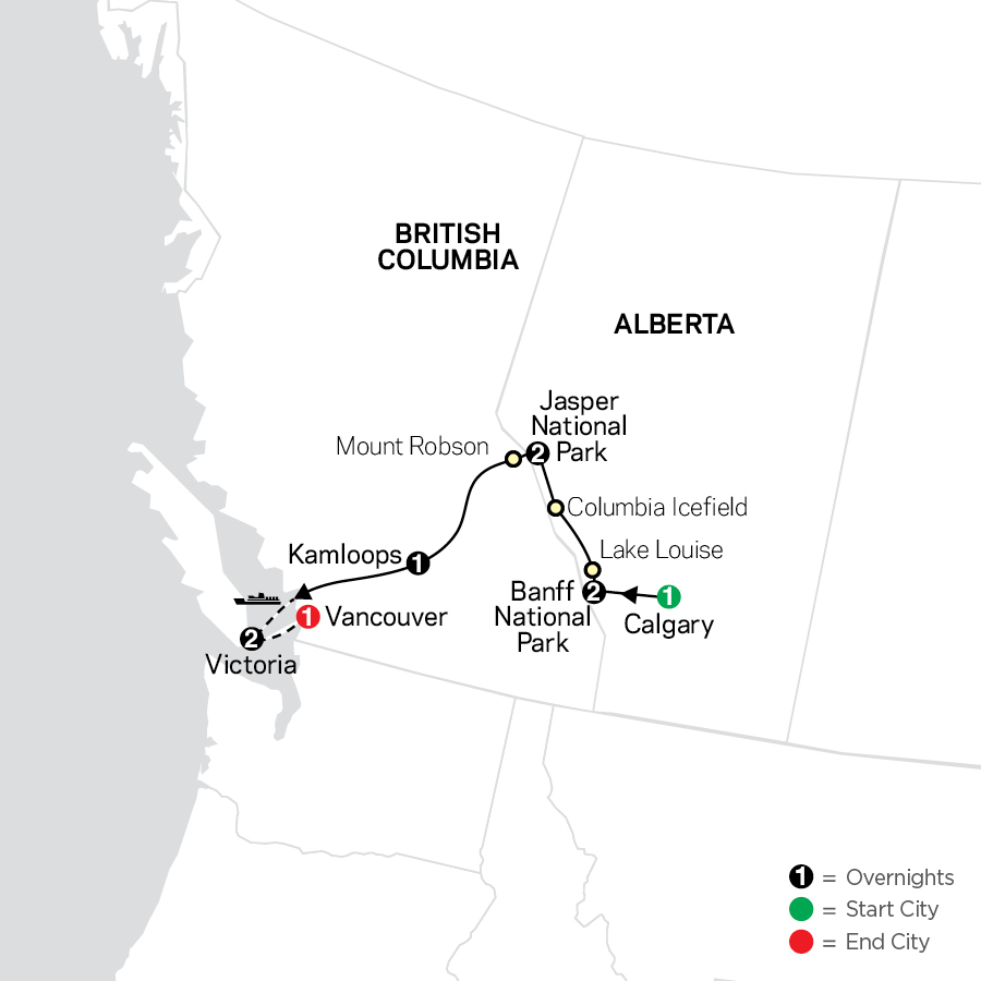The Canadian Rockies are known for their stunning scenery, rugged mountains, breathtaking glaciers, mighty rivers, and gorgeous national parks. On this Heart of the Canadian Rockies tour, you’ll experience all of this and more! You’ll overnight in Calgary, Banff National Park, Jasper National Park, Kamloops, Victoria, and Vancouver. You’ll have two nights in Banff National Park, Canada’s oldest national park and gateway to the Canadian Rockies, and have time on your own to go for a hike, stroll along the river, enjoy the hot springs, check out the quaint shops, and perhaps take an exhilarating optional excursion to view the incredible scenery by helicopter. You’ll also have two nights in Jasper National Park, the largest national park in the Canadian Rockies. You can hike, explore the townsite, or join an optional excursion to see beautiful Maligne Lake and Spirit Island. Between Banff and Jasper, you’ll experience two highlights of this Canadian Rockies tour— a stop at Lake Louise, whose turquoise waters create a natural mirror that reflects the surrounding mountains, and a thrilling ride aboard an Ice Explorer all-terrain vehicle to the Athabasca Glacier, part of the Columbia Icefield, the largest expanse of ice in the Canadian Rockies. Sail across the Strait of Georgia to Victoria where sightseeing includes world-famous Butchart Gardens with its 55 acres of showcase floral displays. You’ll also have free time to explore on your own. Perhaps enjoy high tea at the Empress Hotel, walk and discover Victoria’s delightful historic buildings and harbour, or take the optional Marine Wildlife & Whale-Watching Expedition to seek out the resident pods of orca whales. Ferry across the picturesque Gulf Islands to vibrant Vancouver where sightseeing includes beautiful Stanley Park and other city highlights. All of this and more await you on this once-in-a-lifetime Canadian Rockies adventure!