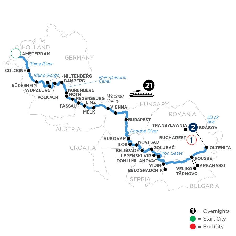 From Holland to Romania, with a host of exciting stops along the way, this river cruise vacation across Europe is truly an adventure! Amsterdam, Holland’s lively capital, is set amongst sophisticated architecture and classic squares and canals with countless museums, cafés, shops, and restaurants to explore. See the treasures of this 700-year-old city on a canal cruise along the elegant grachten. On to Germany for a guided city walk in the 2,000-year-old Cologne. Sail through the dramatic Rhine Gorge the most beautiful view of the Rhine River, where ancient castles stand on cliffs 400 feet above the water and stop in delightful Rüdesheim. There’s guided sightseeing in Würzburg, Bamberg, and Nuremberg, and you’ll sail the Main Danube Canal connecting the Main and Danube Rivers. In Melk, Austria, visit the magnificent Benedictine Abbey, then sail through the picturesque Wachau Valley. Guided sightseeing in each city introduces you to two capitals: Vienna, Austria; and Budapest, Hungary. Continue your river cruise adventure on the Lower Danube with a guided sightseeing in Vukovar and discover Ilok with its 1,000-year-old winemaking tradition. Stop in Serbia’s Belgrade and cruise through the dramatic Iron Gates Gorge. In Bulgaria, visit Belogradchik’s eclectic rock formations, the ancient capital of Veliko Tarnovo, and Arbanassi—with its Church of the Nativity housing an outstanding collection of frescoes. To round out this timeless European River Cruise, enjoy guided sightseeing in Bucharest, known as the “Paris of the East” and a stay in Transylvania with a visit to Dracula’s Bran Castle.