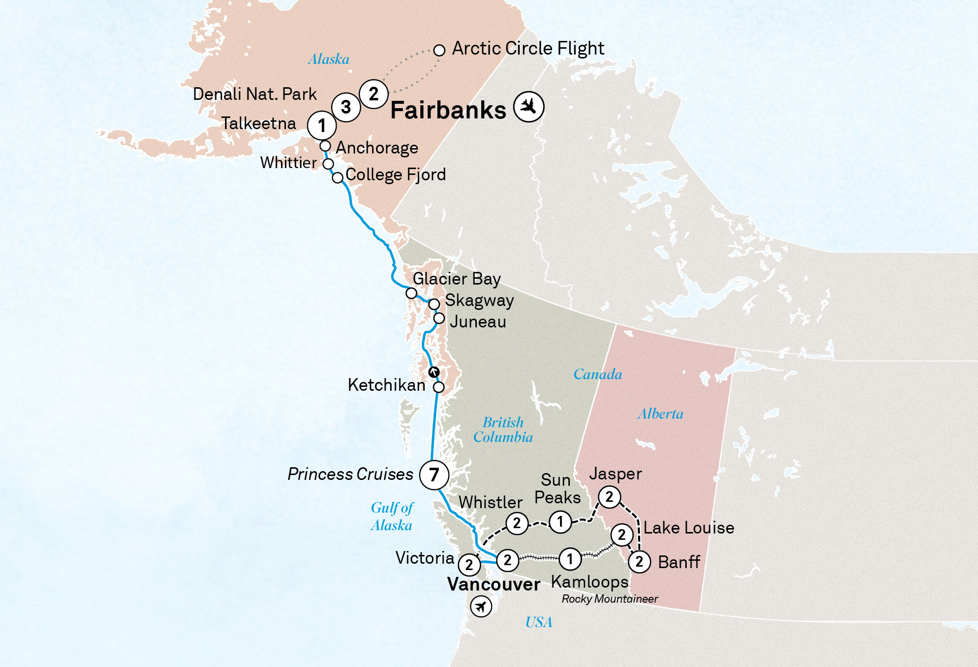 Enjoy a two-night stay at the iconic Fairmont Hotel Vancouver, where you’ll celebrate the start of your travels with a welcome dinner.