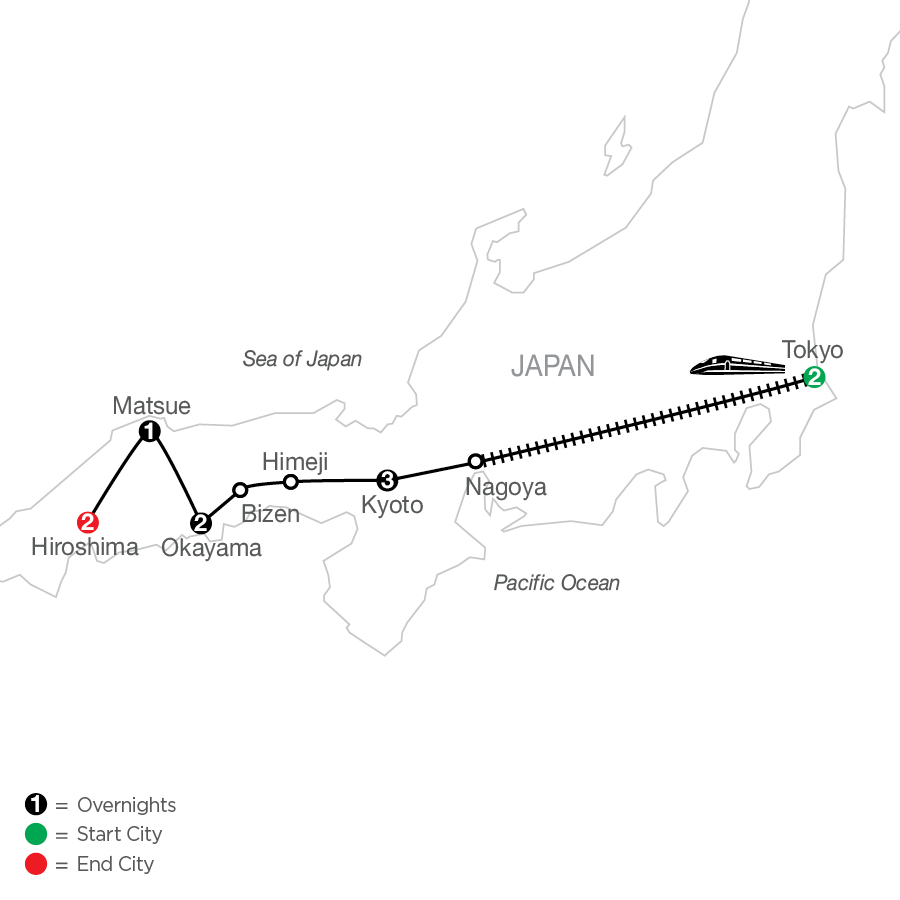 Small groups lead to big experiences on this Small Group Discovery tour of Japan. From its heaven-piercing skyscrapers to its heavenly gardens down below, Japan is a feast for mind, body, and soul. From the lush man-made forest surrounding the magnificent Shinto monuments to vibrant nightlife, vintage teahouses, and venerable temples, Tokyo comes to life with spring’s first cherry blossoms and the first catch of the day in its sushi houses. Be whisked away by shinkansen (bullet train) to Nagoya for more adventure, including a traditional sake tasting. Continue to captivating Kyoto where thousands of brightly hued Torii Gates welcome you to the Fushimi Inari Shrine. Step into ancient bliss of the Temple of the Golden Pavilion and (“Zen” some!) with a traditional Japanese tea ceremony. Glide into tranquility on the serene waters lapping the shores of Amanohashidate sandbar and ponder the power of nature in Koraku-en Garden. Nature abounds again in Matsue, nicknamed the “City of Water,” where you’ll discover the beauty of the Adachi Museum’s world-renowned gardens and art. Your tour of Japan takes you to the hallowed grounds of Hiroshima’s Peace Memorial Park and Memorial, preserved just as it was on August 6, 1945. So much history, mystery, and magnificent beauty awaits you on this fascinating Small Group Discovery tour of Japan.
