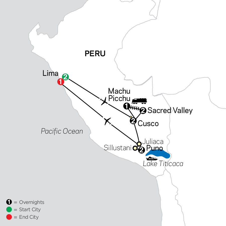 On this Peru tour, delve into the past as you spend time in Lima, the Sacred Valley, Machu Picchu, Cusco, and Lake Titicaca. Along the way, visit ancient ruins, see beautiful scenery, and enjoy guided sightseeing with Local Guides and a Tour Director dedicated to bringing you these destinations and to helping you learn about the local cultures. History comes alive on this tour through Peru. Imagine what life was like in the 15th century as you tour the ancient ruins of Machu Picchu, where you'll see this famous Inca complex of palaces, plazas, temples, and homes set in a majestic setting. More history awaits at Ollantaytambo, the archaeological site of the Incas’ resistance during the Spanish conquest, and the Temple of Sacsayhuaman, a fortress with some of the best examples of Inca masonry. Guided sightseeing in Cusco features the Santo Domingo Monastery, where the Inca foundations remain under the Spanish baroque structures, and the Cathedral, housing a magnificent collection of artwork. On this Peru tour, you'll also learn about the local culture. On your motorboat tour of Lake Titicaca, you'll visit Taquile Island, where you'll see how the local people integrate their Inca and Spanish past, and the Uros Floating Islands, where you'll learn how the Uros people construct their islands, homes, and boats from totora reed, a centuries-old practice. In the Incan town of Ollantaytambo and visit with locals in their homes for insight into their way of life. Spend time at the famous market in Pisaq and learn about the importance of camelids (llama, vicuña, alpaca, and guanaco) to Inca culture. These are just some of the many highlights of this Peru tour. Designed for savvy, value-minded travel lovers, it's a vacation of a lifetime!