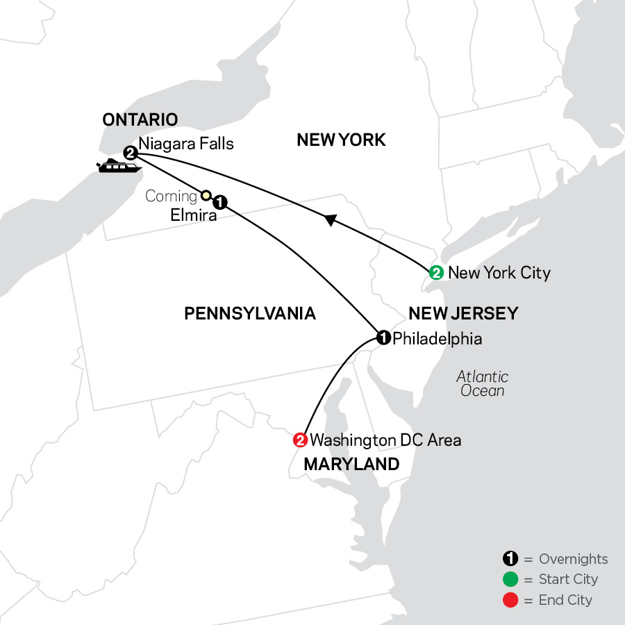 Experience vibrant cities, historic sites, and awe-inspiring natural wonder on this affordable East Coast vacation. You’ll spend two nights each in New York City, Niagara Falls, and the Washington DC area, and an overnight in the Corning, NY area (Elmira) and Philadelphia. Enjoy touring New York City with a Local Guide and see major attractions including Broadway, Times Square, the Empire State Building, Rockefeller Center, and more and then have time to explore the “Big Apple” on your own. Travel into Canada to experience breathtaking Niagara Falls! Be sure to have your camera ready as you enjoy an exhilarating sightseeing cruise that gets you up close to the thundering 600,000 gallons of water that comes crashing down every second! Have time on your own to visit the Botanical Gardens, ride the aerial cable car, or go on an unforgettable optional helicopter tour over the falls with a view like no other! Head to Corning, NY and visit the world’s most comprehensive collection of glass at the Corning Museum of Glass. Continue on through the picturesque Poconos and beautiful Appalachian Mountains en route to Philadelphia, where you’ll see landmarks like the Liberty Bell at Independence National Historical Park, known at the birthplace of American democracy. In Washington DC, take a tour with a Local Guide and visit the Lincoln Memorial, see the Washington Monument, and Ford’s Theatre where President Abraham Lincoln was assassinated, and enjoy photo stops at Capitol Hill and the White House. Enjoy free time to visit the amazing museums of the Smithsonian, take a walk along the Mall, or see the Kennedy graves and Changing of the Guard at Arlington National Cemetery. From exciting cities to historic landmarks to the amazing natural wonder of Niagara Falls, this East Coast tour will have you returning home with stories to tell, photos to share, and memories to last a lifetime!