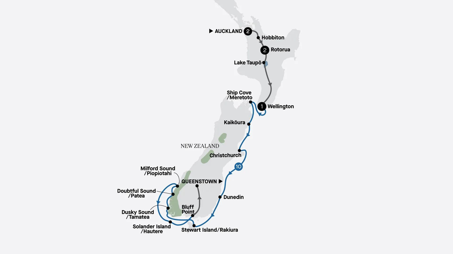 Discover New Zealand on this 16-day journey combining land exploration with an unforgettable small ship cruise. Begin in Auckland and venture south through Rotorua’s geothermal landscapes and Maori cultural heart, before continuing to Wellington. From here, set sail along the South Island’s dramatic coast, exploring historic Ship Cove, whale-rich Kaikoura and charming Akaroa. Encounter the untouched beauty of Stewart Island and sail deep into the majestic fiords of Dusky, Doubtful and Milford sounds. Finish your journey in Queenstown, surrounded by alpine grandeur.