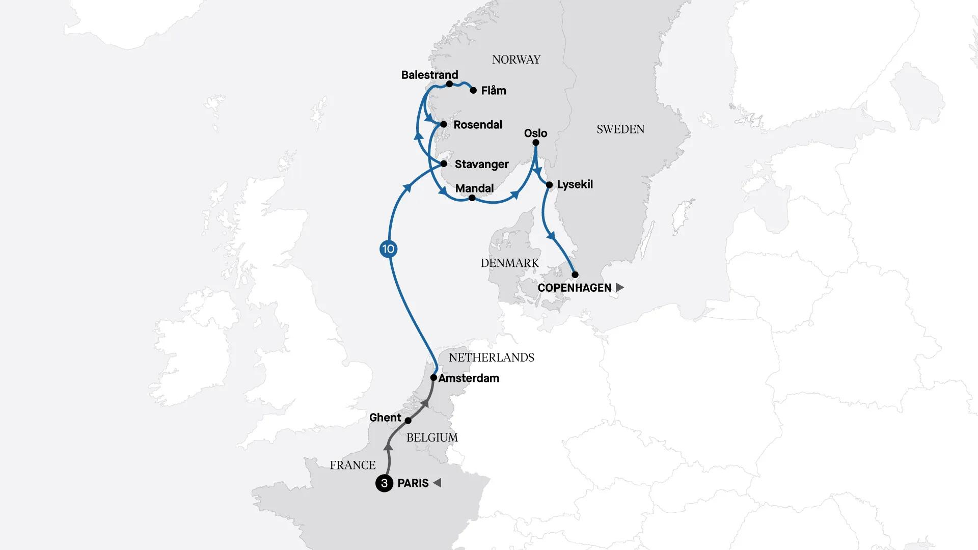 Discover the boulevards, boutiques and bistros of Paris before a cruise from the charming city of Amsterdam to the colourful harbours of Copenhagen on an unforgettable voyage through Northern Europe. Cross the North Sea to Norway’s dramatic fjord country, where sheer cliffs, tumbling waterfalls and glassy waters frame storybook villages like Flåm and Balestrand. Discover Stavanger’s maritime heritage, stroll Rosendal’s rose-scented streets, and soak up the culture of Oslo. Along the Swedish coast, explore the seaside town of Lysekil, before your journey concludes in Copenhagen, a city of cobbled streets, royal palaces and cutting-edge design. From historic ports to breathtaking natural wonders, each day brings a new perspective on Scandinavia’s coastal beauty.