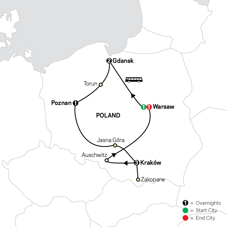 A rich cultural heritage, fascinating history, and beautiful landscapes make Poland an interesting place to discover. On this Poland tour, you’ll spend two nights in Warsaw and Gdansk, three nights in Kraków, and one night in Poznan. Along the way, learn about Poland’s history and visit some of its historic cities with their charming old towns, and some UNESCO World Heritage Sites. Enjoy sightseeing with a Local Guide—an expert in the city’s history, sights, culture, and secrets—in Warsaw, Gdansk, Torun, Poznan, and Kraków. Torun is the birthplace of renaissance astronomer Copernicus. In the Middle Ages, it was a prominent trade hub as a member of the Hanseatic League. Dating back to the 7th century, Kraków is known as Poland’s most beautiful city and cultural capital. Here, the sightseeing tour features the Market Square, one of Europe’s loveliest squares, along with Wawel Hill. Gdansk is a beautiful port city on the Baltic Sea, which played an important role in recent history by facilitating the events that brought to the fall of the Berlin wall. You’ll visit the monastery of Jasna Góra in Czestochowa, an important pilgrimage spot. Its Black Madonna, a painting of the Virgin Mary, is a symbol of the country and venerated as the "Queen of Poland." You'll also visit what is left of the Auschwitz concentration camp, a chilling reminder of the Holocaust. Enjoy the included excursion to Zakopane, a mountain resort in the Tatras, a favorite holiday spot for locals and visitors. You’ll have a chance to do a little hiking or to relax, taking in the spectacular views. You’ll arrive home from this value-minded tour through Poland with a new appreciation of Poland’s history, culture, nature, and wonderful cities—an enriching adventure!