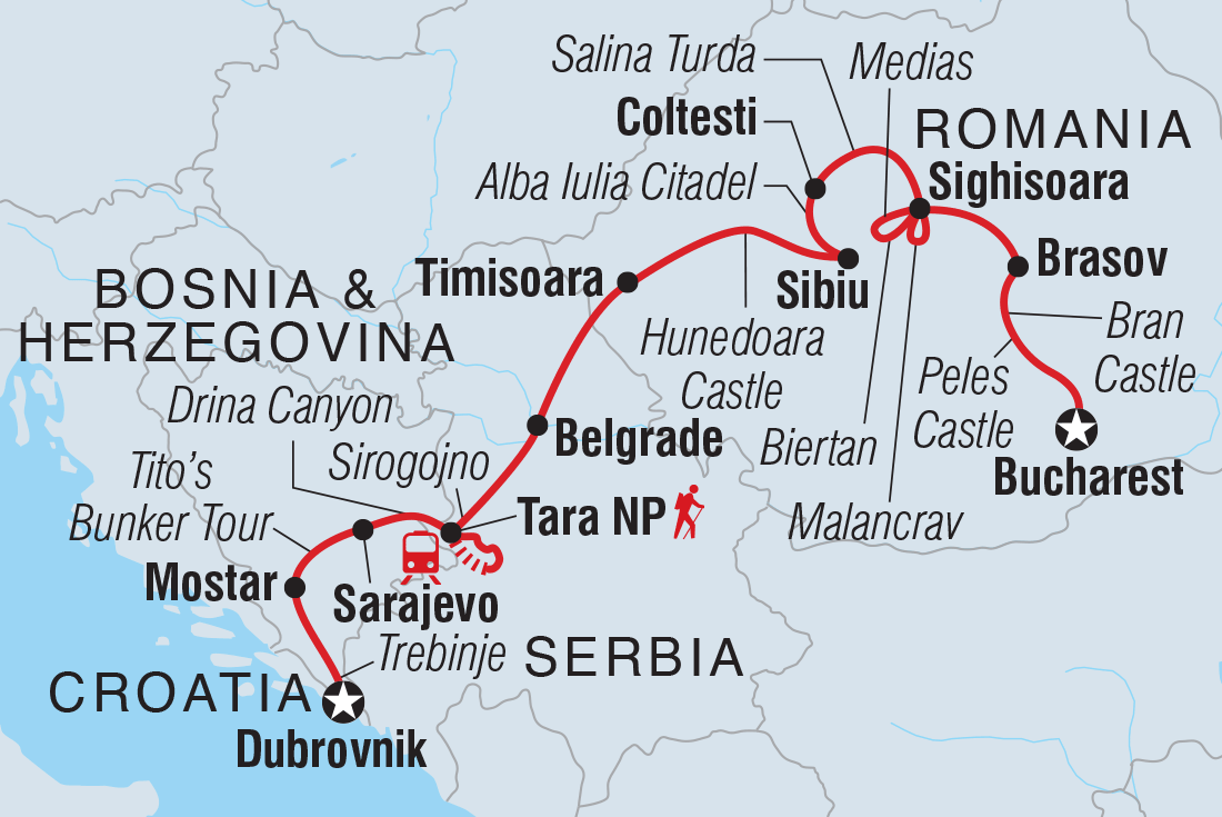 Today, travel to Serbia, with a stop in the small town of Visegrad. Here, a 16th-century bridge that inspired the Nobel Prize winning literary work ‘The Bridge on the Drina’ dominates the horizon. From Visegrad, you’ll head to Drina Canyon for a warm welcome to Serbia – a boat tour with local food tasting. After your scenic lunch, you’ll board a steam train in Mokra Gora National Park for a scenic ride through forests and mountains. Served by one the last operational steam trains in Europe, this stretch of historic railway is part of the renowned Ciro trail, connecting Belgrade and the Adriatic Sea. Tonight, you’ll stay near the town of Zlatibor in your Feature Stay accommodation – a group of wooden chalets with their own private swimming pools and views of the surrounding countryside.