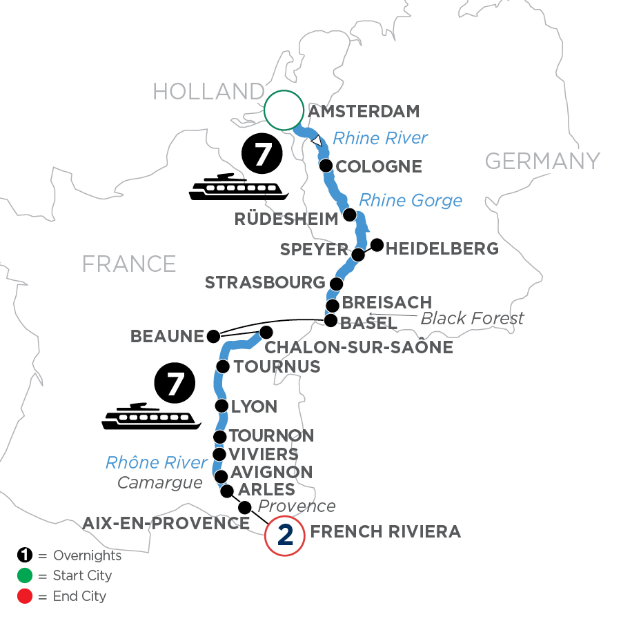 Immerse yourself in French and German culture on this fabulous European river cruise vacation along the Rhine, Saône, and Rhône Rivers. Enjoy spectacular views and romantic splendor of this magical journey ending with a night in Marseilles. It all begins in Holland’s popular, modern capital of Amsterdam. The best way to see the treasures of this 700-year-old city is on a canal cruise along the elegant Grachten. Cologne, Germany, a 2,000-year-old city best known for its Gothic architecture and famous twin-spired cathedral, comes alive on a guided walk. Sail through the dramatic Rhine Gorge, the most beautiful view of the Rhine River where ancient castles stand on cliffs 400 feet above the water. Strasbourg, France, located on the French-German border, perfectly blends the cultures of both countries. Breisach, Germany, is the gateway to Germany’s Black Forest—an area of unrivaled natural beauty. Visit France’s gastronomic capital of Lyon a showcase of medieval and Renaissance architecture. Continue to the city of Tournon beautifully nestled among vineyards. Here, you’ll take a guided walk in this medieval treasure with Roman ruins and a fascinating 16th-century castle. In Avignon, visit the Palace of the Popes and take pictures of the bridge in the famous song “Sur le pont d’Avignon.” Enjoy your 2 last nights in the French Riviera. Relax along the remarkably blue water of the Mediterranean Sea—a perfect ending to this once-in-a-lifetime European river cruise through Germany and France!
