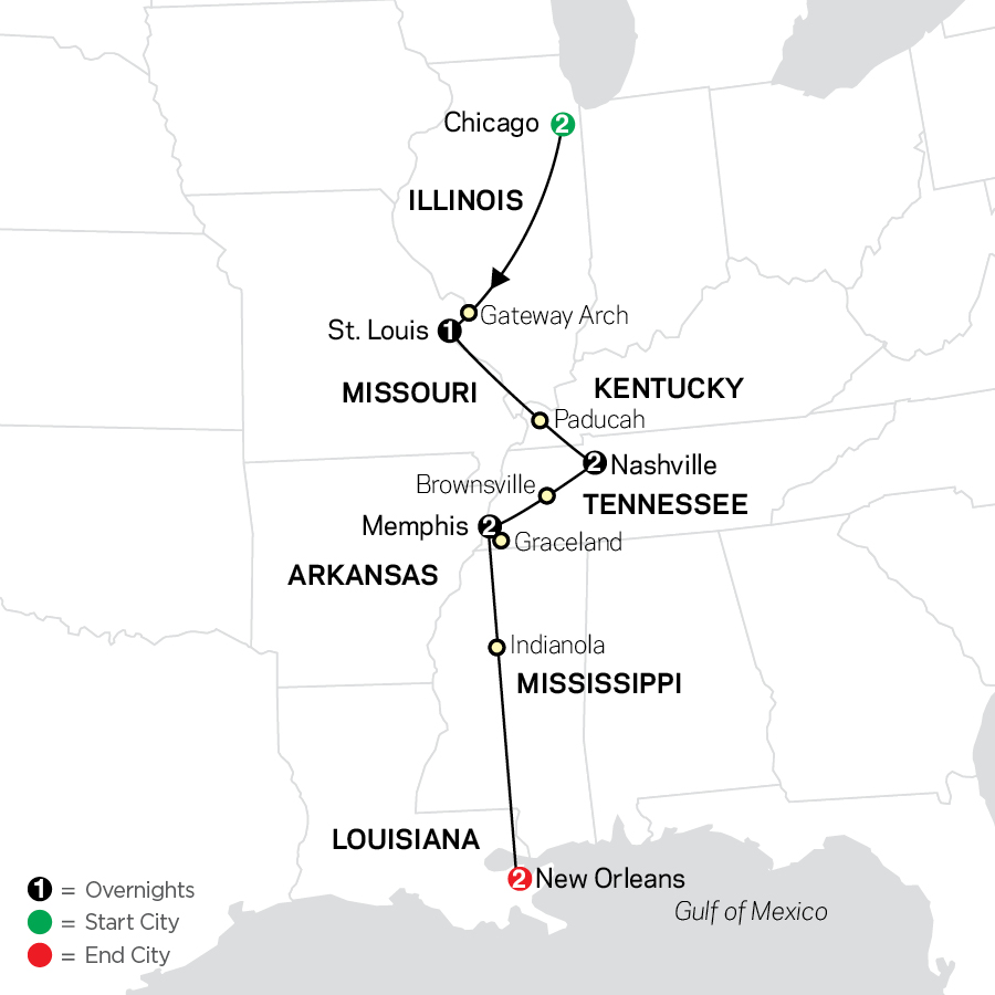 Take a musical journey through America’s Heartland featuring locations that have played a role in the evolution of American music. This fun vacation starts with two nights in the vibrant city of Chicago, then travel south via St. Louis to the capital of country music, Nashville. Take a city tour that includes seeing Centennial Park with its reproduction of the Parthenon, then that evening, enjoy reserved seating at a show at the Grand Old Opry where country music legends like Dolly Parton, Johnny Cash, and Willie Nelson have graced the stage. Have time to take an optional excursion to RCA Studio B, birthplace of the “Nashville Sound”, and explore the Country Music Hall of Fame, filled with the stories and memorabilia of country’s biggest stars. Continue on to Memphis, the city known as the “Home of the Blues” and the “Birthplace of Rock ‘n’ Roll”, stopping along the way in Brownsville to visit the Tina Turner Museum, housed in the one-room schoolhouse that a young Anna Mae Bullock (a.k.a. Tina Turner) attended. Arrive in Memphis and take an orientation tour that includes historic Beale Street and learn about its role in the birth and development of blues music. Join an optional excursion to legendary Sun Studio and stand in the same spot where Elvis first recorded. Tour Graceland, Elvis’ lavish home and see his favorite cars, custom jets, and the memorial garden where he and his only child, Lisa Marie, are laid to rest. Then on to Indianola, MS to the B.B. King Museum and Delta Interpretive Center which tells the story of this music legend and the region that gave birth to the Blues. Spend time in New Orleans, where you’ll enjoy guided sightseeing of all the major sites in “The Big Easy”. Enjoy free time to explore the French Quarter, try some of the culinary treats that New Orleans is famous for, like beignets, po’boy sandwiches, and gumbo, and perhaps join an optional swamp or plantation tour. And what better way to complete your musical journey than on an optional Mississippi River paddleboat dinner cruise with live jazz! The perfect ending for this music-filled, value-minded vacation!