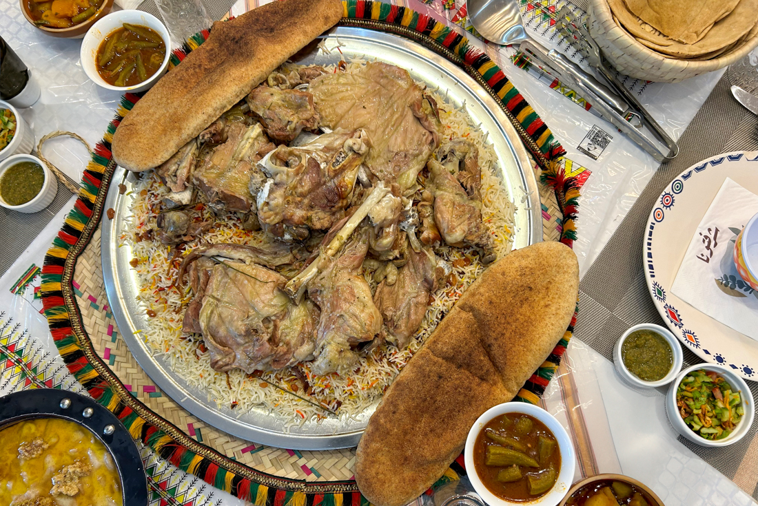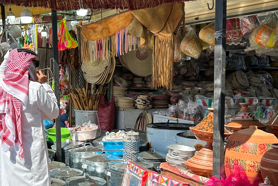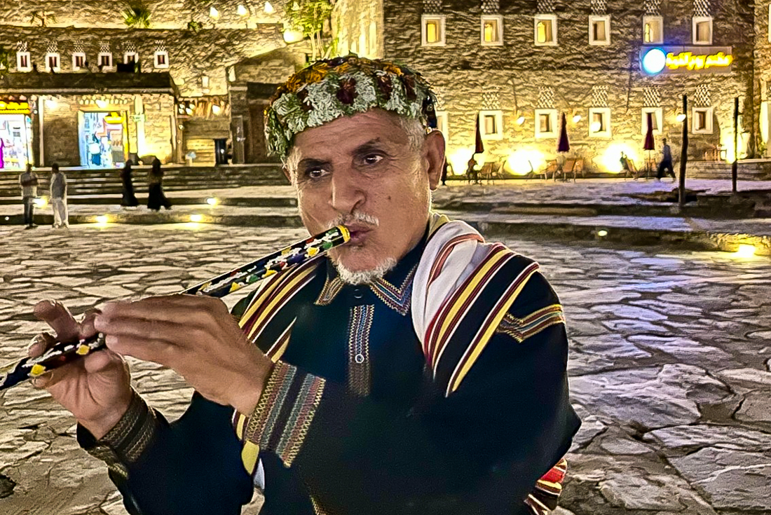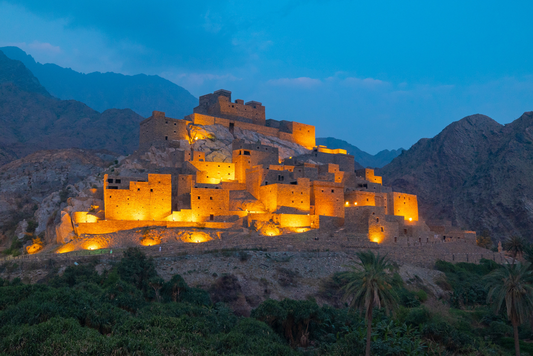 Today, travel by 4WD to Tabab Village, nestled in the fertile Asir Highlands. When you arrive, set off on a guided walk through this UNESCO World Heritage site before sharing a traditional light lunch of southern bread, cheese, olives and herbal tea. Known for its terraced farms, honey and rich cuisine, the region showcases deep agricultural traditions. Then, visit the Abo Noghta Castles – six ancient fortresses built from mountain stone and valley marble. After, continue to Rijal Alma, known for its striking stone towers inlaid with white quartz. Explore with a local guide, discover the UNESCO World Heritage-listed Al-Qatt Al-Asiri art painted by women, and learn about the Flower Men of the Qahtani tribes, whose colourful garlands preserve traditions over 2000 years old.