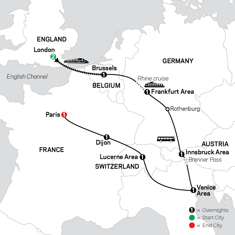The world is within reach with everything you need for perfectly affordable touring. Cosmos includes hand-selected accommodations, guided sightseeing, and seamless transportation between destinations—with value-minded travel lovers in mind. Explore with expert Cosmos Tour Directors and Local Guides, and private, first-class, and air-conditioned motorcoach. Enhance your free time to explore like a local with your CosmosGO mobile app! Your Tour Includes:• Scenic Eurostar train from London to Brussels• Orientation tour of Brussels• Scenic cruise on the Rhine River • Scenic drive on the Romantic Road• Orientation tour of Rothenburg• Scenic drive across the Europa Bridge and Brenner Pass to Venice• Private canal boat ride in Venice to St. Mark’s Square with glass-blowing workshop• Orientation tour of Lucerne • Guided sightseeing in ParisExtend your vacation with an extra night in London (Tour 4425)