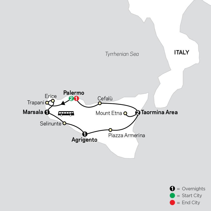 Join us on a budget-friendly vacation in Sicily—the Mediterranean’s largest island, just off the toe of Italy’s “boot.” Your discovery of this fascinating island, rich in culture, warm welcomes, and beauty starts in Palermo, a vibrant city of churches, squares, marketplaces, and palazzos of every style. Take in stunning views with a cable-car ride to the medieval hilltop town of Erice—with cobblestone streets, fortifications, ancient churches, and breathtaking views over the Mediterranean Sea and the Egadi Islands. Enjoy a guided tour of Trapani, set on a harbor that was once a powerful trading network, and visit Marsala, known for its aromatic wine. See the Acropolis and the temples in Selinunte, and take a guided tour of the spectacular ancient Greek temples near Agrigento. Visit the Roman Villa at Casale, famous for its mosaics, like the “Bikini Girls.” Visit elegant Taormina and the coastal town of Cefalù. Enjoy an excursion on Mount Etna, the majestic volcano overlooking the city of Catania, the verdant valleys, and the shimmering blue Mediterranean waters. Celebrate your Sicilian adventure ending your affordable adventure in Palermo.