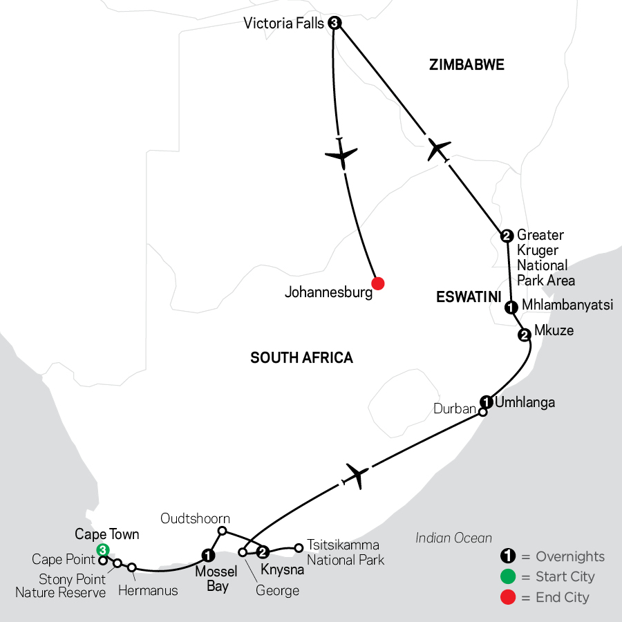 Your tour ends with a flight to Johannesburg. Schedule departing flights after 7:30 pm. (B)