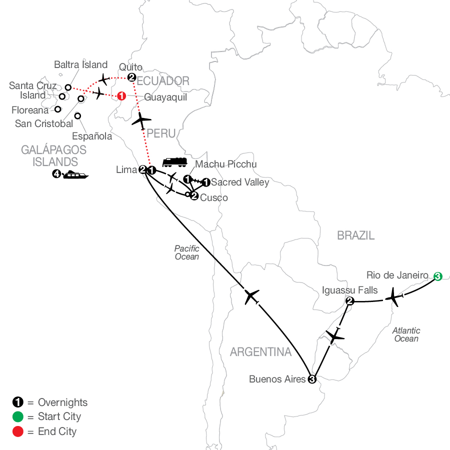 Rum and rumba. Ruins and rainforests. Rio and revelry. This carefree vacation to South America has just the R&R you crave. From Brazil to Argentina and Peru to Ecuador, this multi-country tour of South America delivers a healthy dose of take-me-away scenery, sights, and sizzling culture. Sip caipirinhas at the top of Rio de Janeiro’s Sugarloaf Mountain. Learn the sultry steps of the tango in breezy Buenos Aires. Put down your book and lose yourself in the real-life mystery of Machu Picchu. The health, wealth, and safe travels bestowed upon you at a traditional Mother Earth Ceremony in Peru’s Sacred Valley will come to fruition as you feel the magical mist of the roaring Iguassu Falls, taste the creative cuisine in the world-renowned culinary capital of Lima, and travel back five centuries as you stroll along the stone streets of the Inca capital of Cusco. With your inner historian awakened, don’t forget your inner naturalist! Cruise around the famed Galápagos archipelago, where you’ll share the shores with every native species from the blue-footed boobies to the pint-size penguin. A meet-and-greet with a colony of sea lions seals the deal on this wondrous extension to your South America vacation.