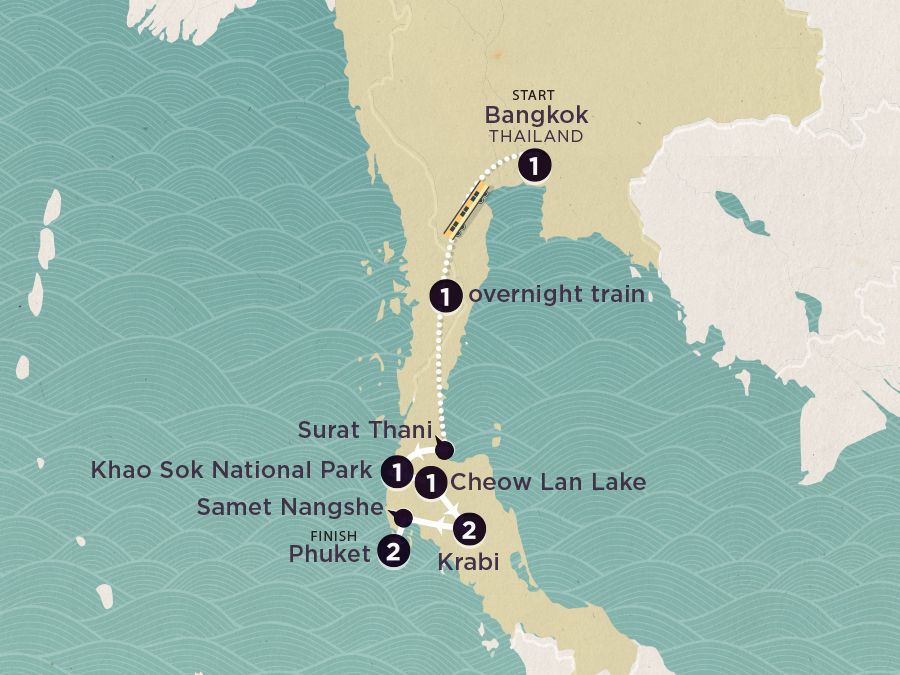 You’ve got a full day to make the most of Bangkok. Need recs? Pull on your history hat and explore the city on two wheels during an optional bike tour. Whizz up Khaosan Road (a former rice market turned backpacker haven) before stopping off at stunning temples, old-school steam train depots and the beaut Grand Palace. Want to delve a little deeper? Feast your eyes on the official royal residence and Wat Pho with its real big golden buddha during an optional guided tour. Tonight, stock up on snacks and change into a comfy ‘fit. Why? Cos we’re catching an overnight train to Surat Thani. Shotgun the top bunk!