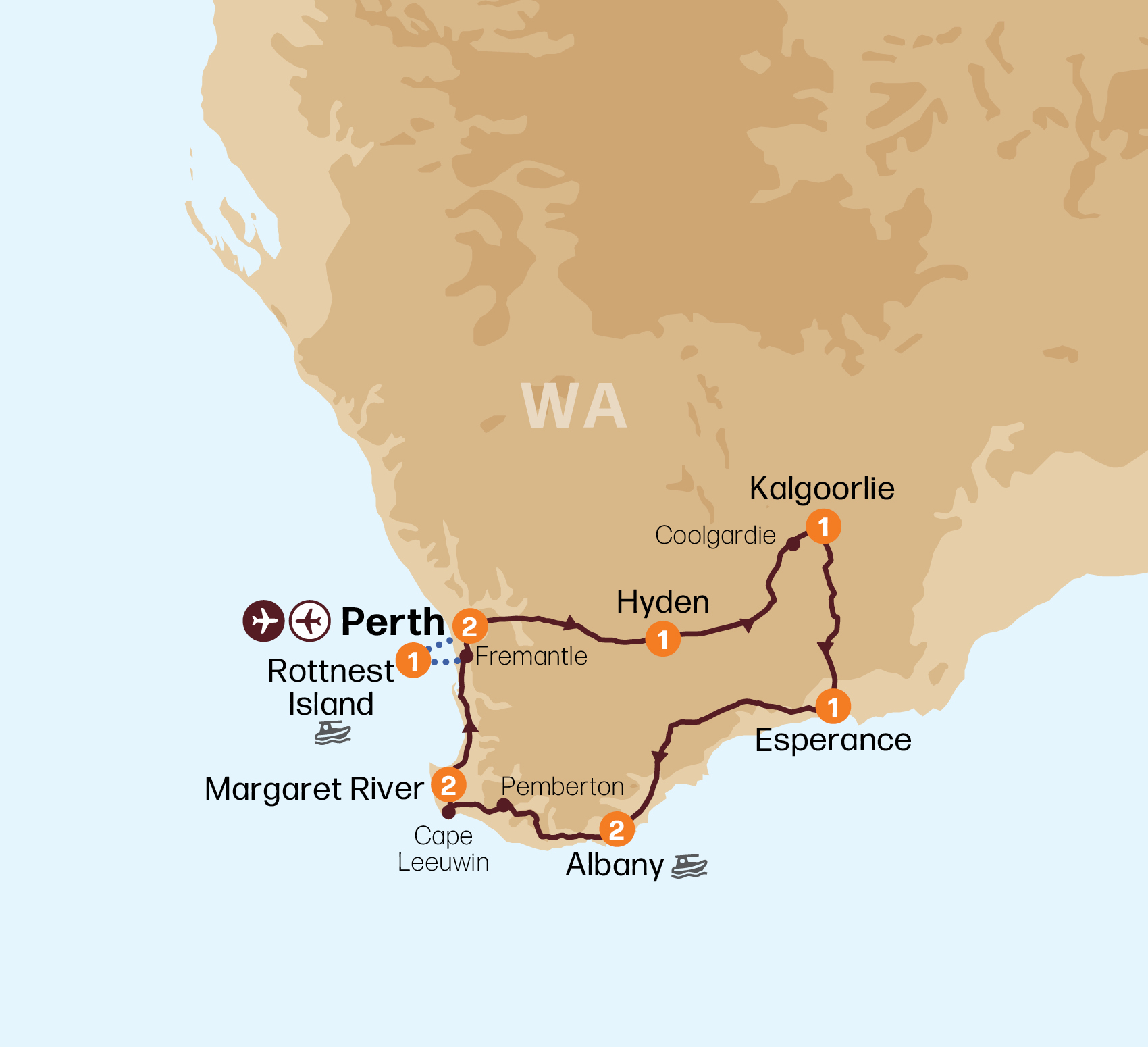 This morning we depart Perth and travel east through the John Forrest National Park. Visit York and the historic York Motor Museum before continuing to Hyden, arriving mid afternoon. This tiny town located in Western Australia’s semi-arid wheat belt is home to the fascinating and unique geological formation known as Wave Rock. After exploring Wave Rock we overnight at the Hyden Wave Rock Motel. Meals (B.L.D).