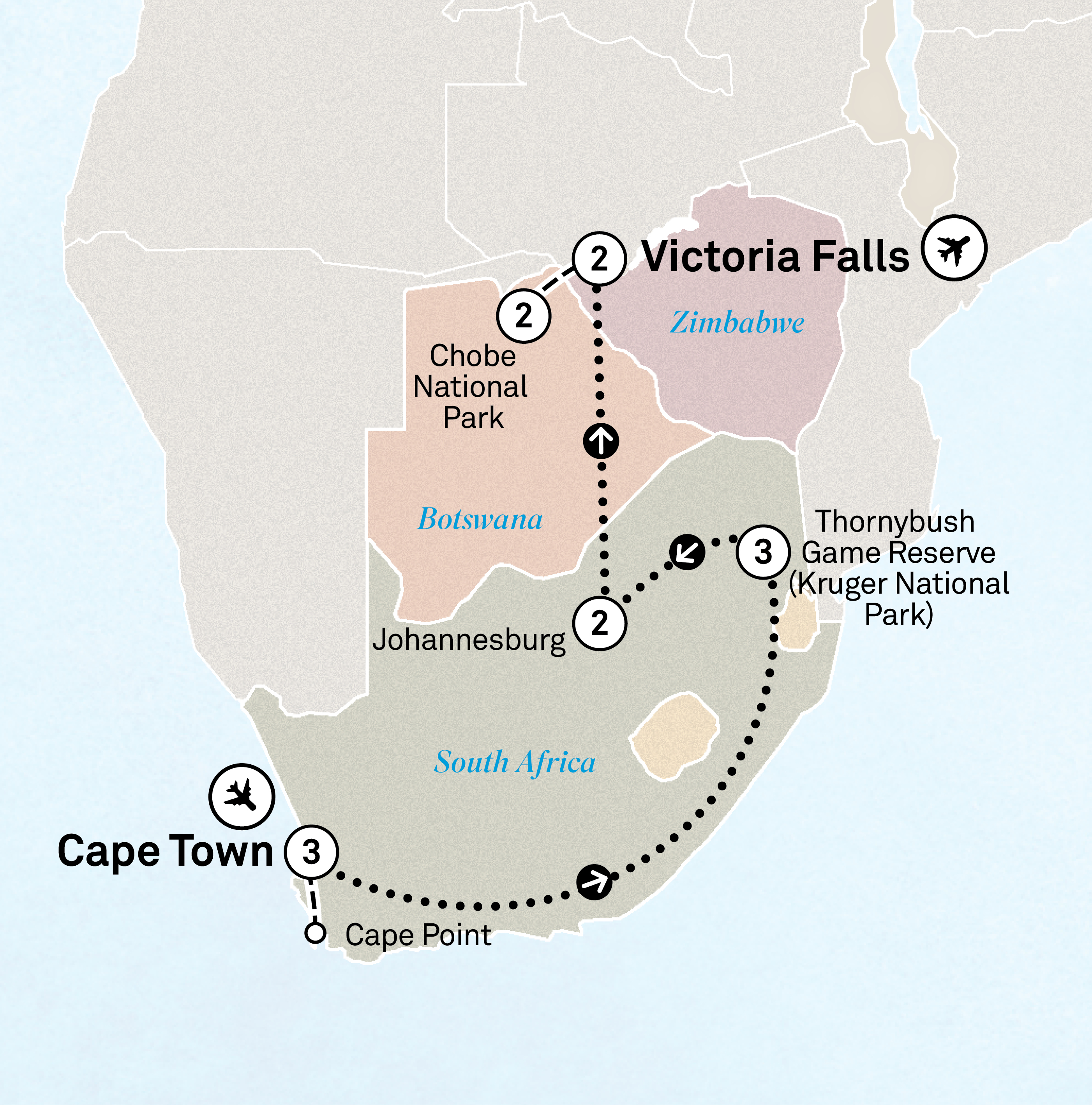 Fly to Hoedspruit and transfer to your luxurious lodge, nestled on the edge of the renowned Kruger National Park. Enjoy a three-night Scenic Special Stay, indulging in the lodge's exceptional amenities and breathtaking natural surroundings. Embark on your first safari this afternoon, venturing into the wild to spot Africa's iconic wildlife, including the Big Five. Thornybush offers a deeply immersive bush experience with expert guides, enhancing your chances of unforgettable wildlife encounters.
